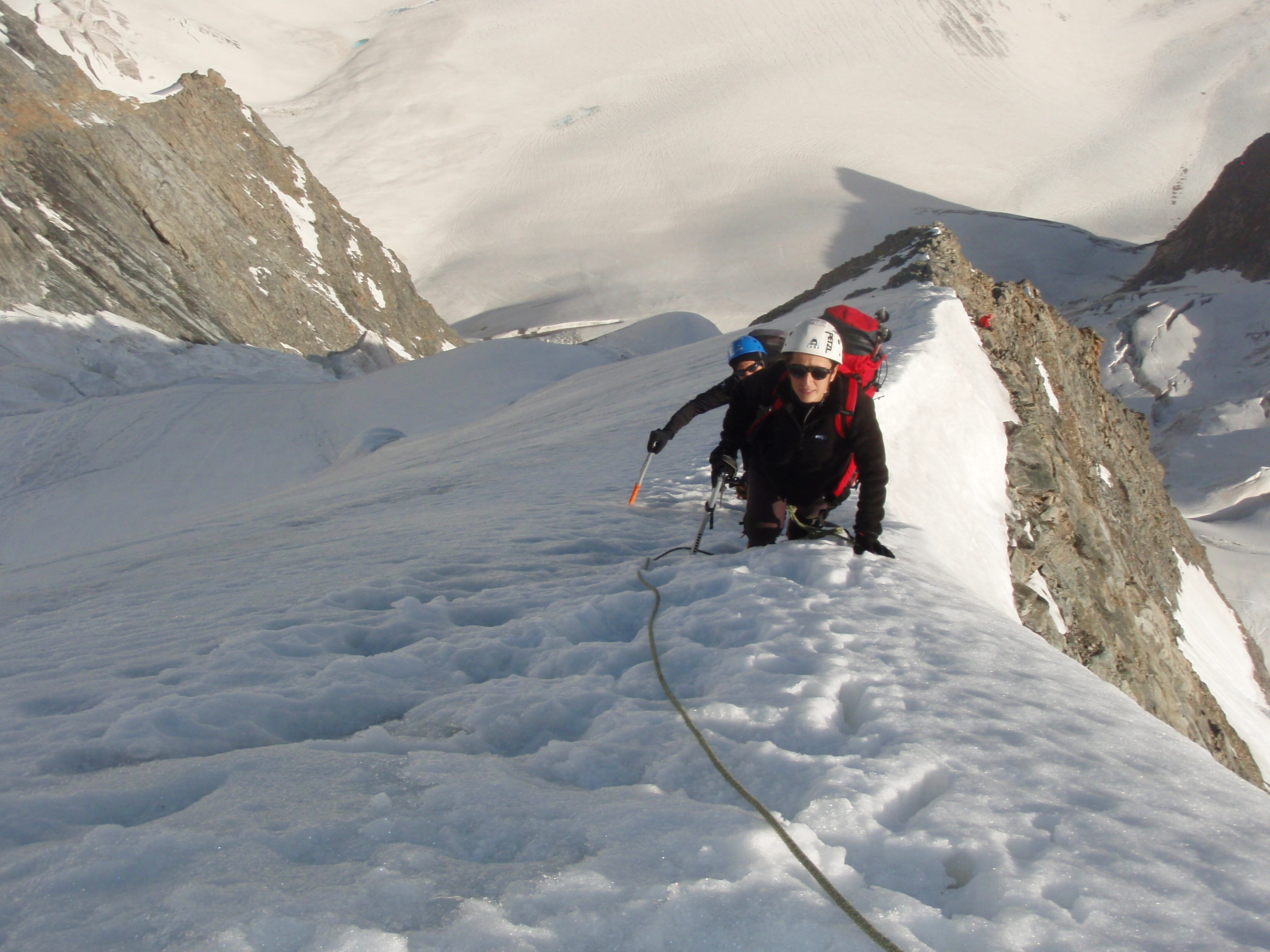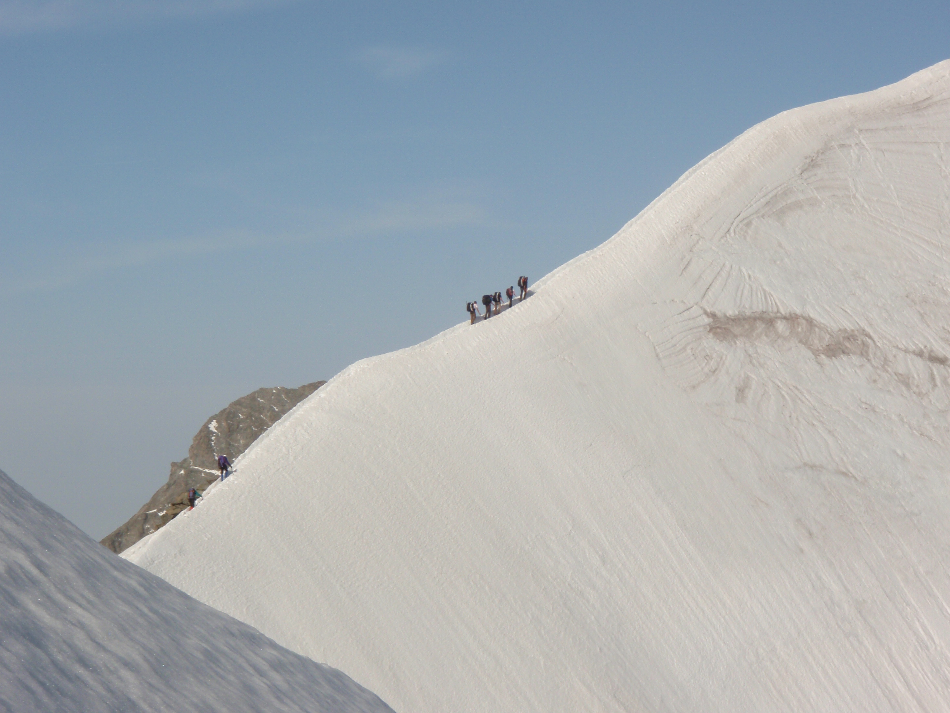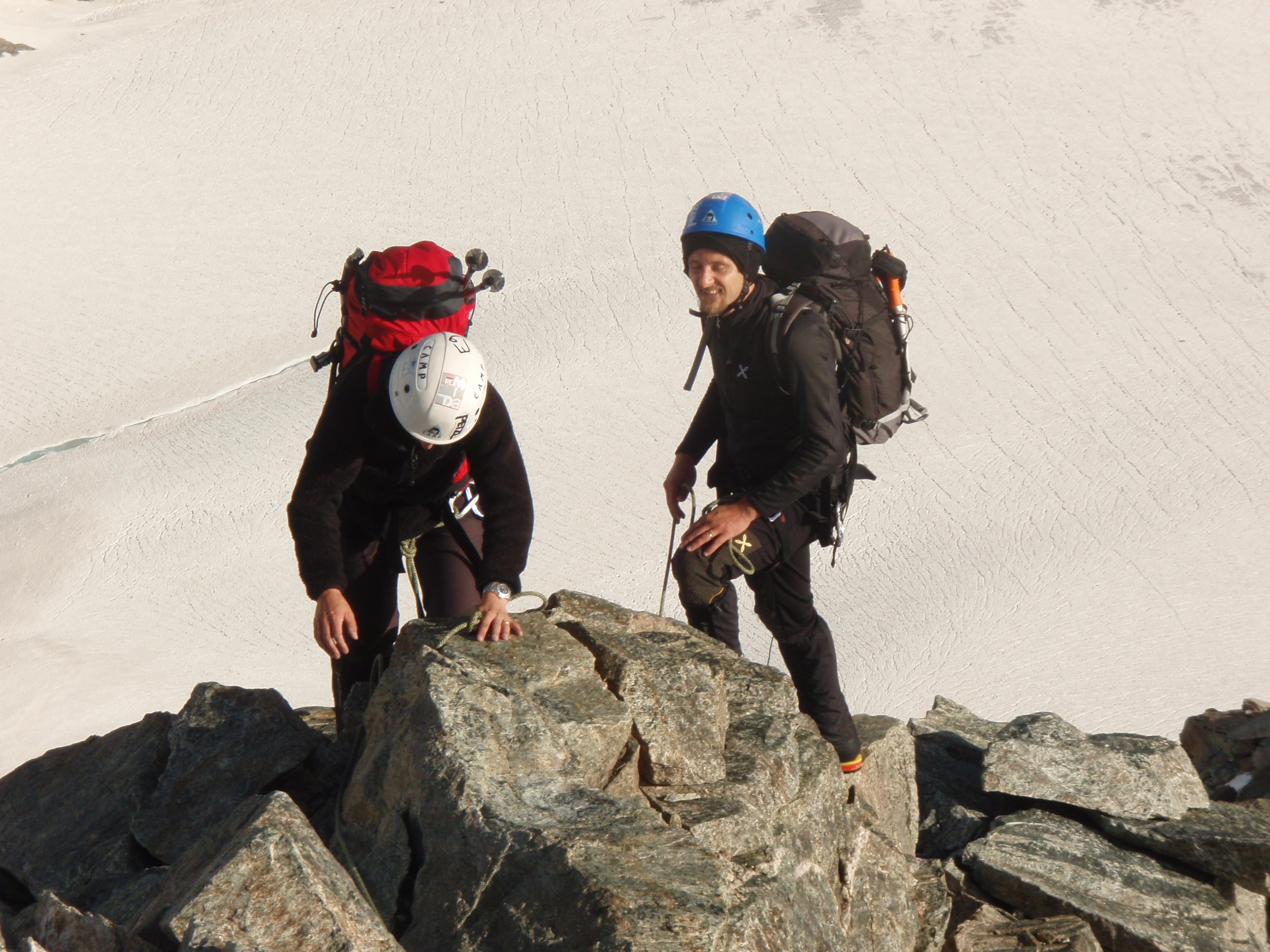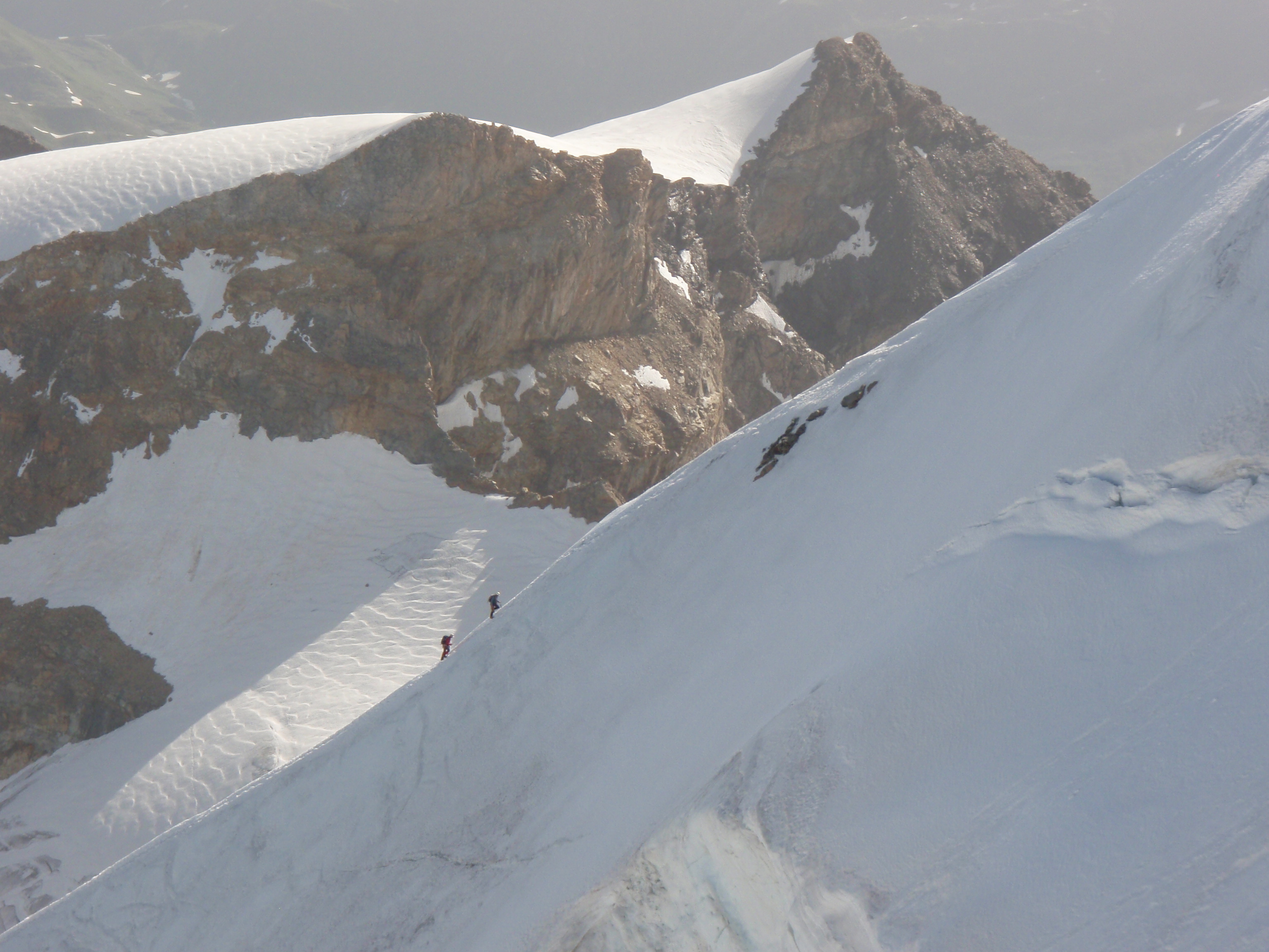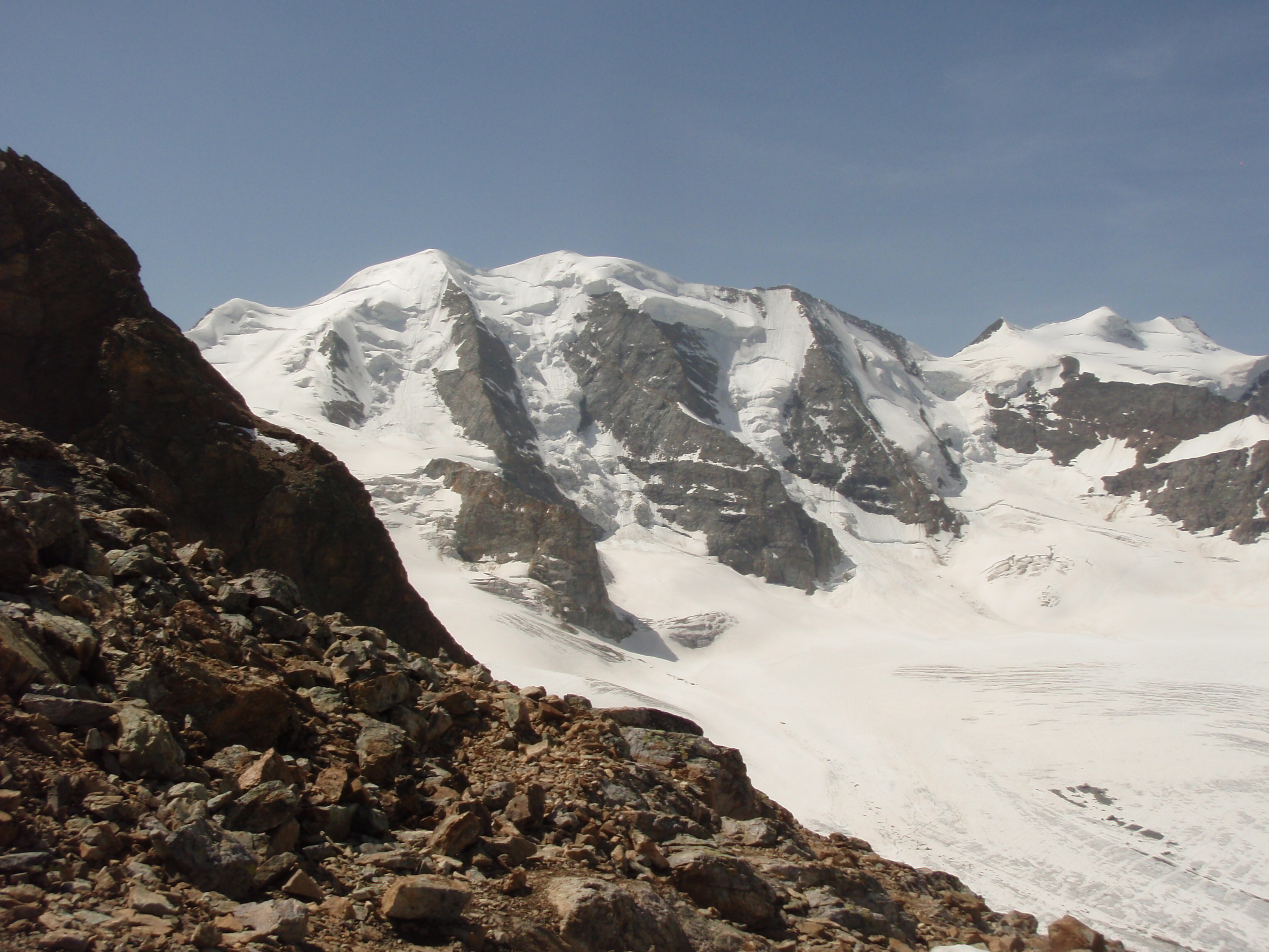 Il Palù è una gran bella montagna, molto conosciuta e frequentata soprattutto dagli alpinisti di lingua tedesca forse anche grazie film pre-Reich e pre-Goebbels del 1929 “Inferno Bianco” , in cui c’era Leni Riefenstahl come attrice. La parete nord del Piz Palù precipita per 900 metri con tre grandi speroni sulla Vadret da Pers. La Kuffner sale per l’estetico sperone orientale, prima con una gradevole arrampicata su roccia, poi per una cresta nevosa mai troppo ripida proiettata verso il cielo. Bravi come sempre Cristina e Graziano: alle 9 eravamo in vetta! Mic