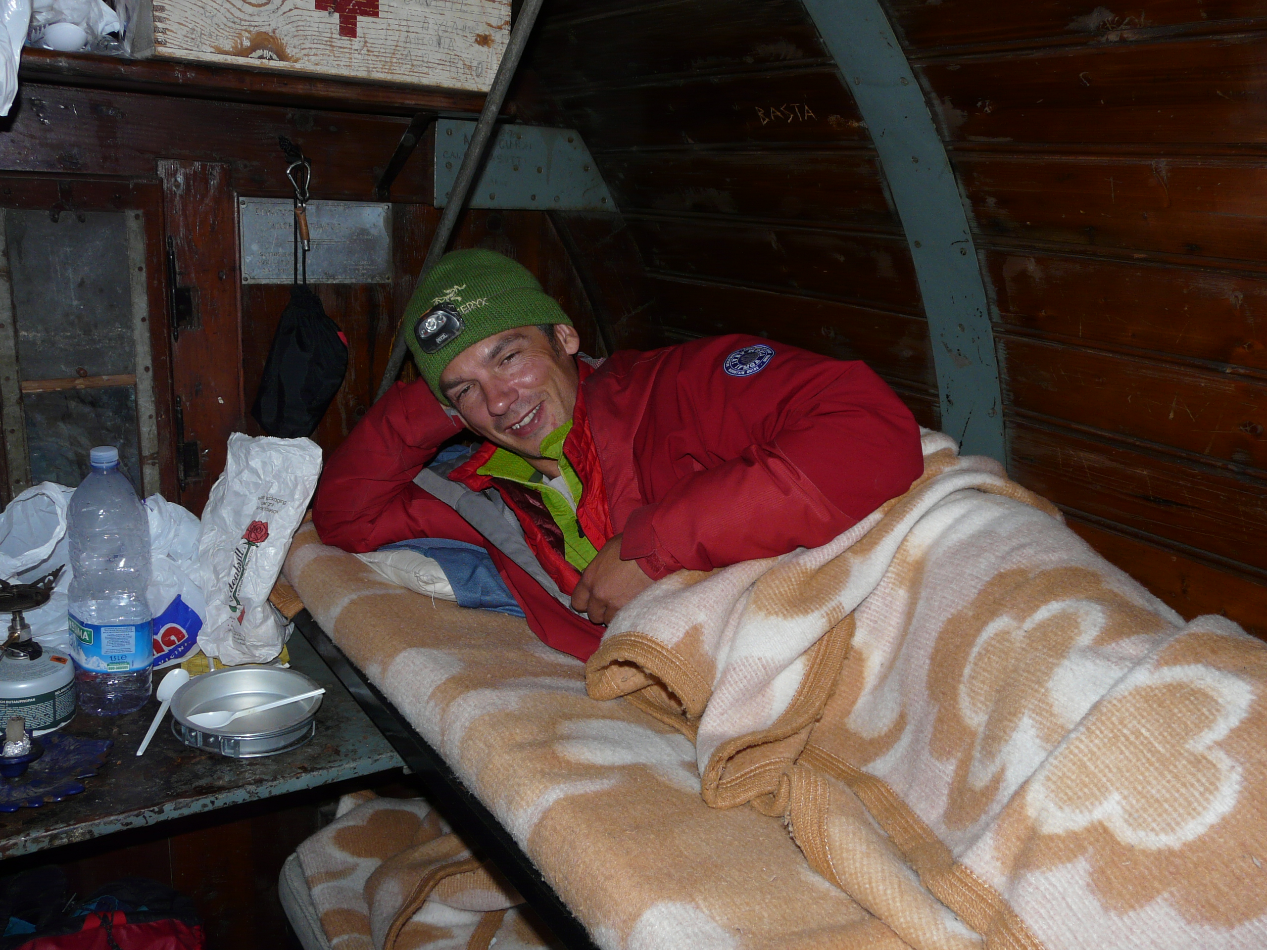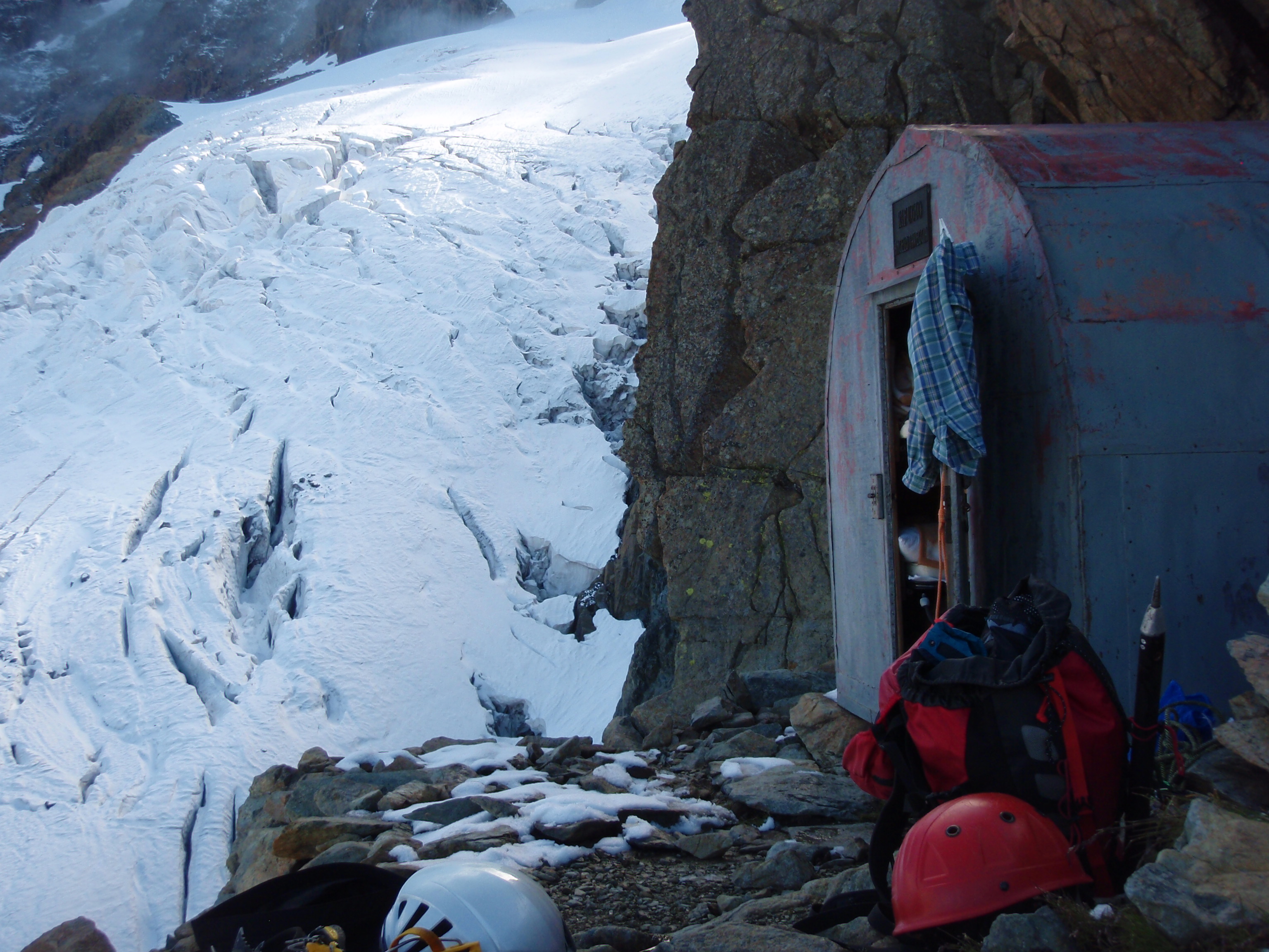 Siamo in tre, ormai avvolti come bozzoli dentro le coperte nel minuscolo bivacco a quattro posti, quando due giovani alpinisti austriaci bussano al pesante portone metallico. E’  quasi buio, ma suggerisco loro di affrettare il passo e raggiungere il più comodo bivacco Oggioni 1 ora più sù…Sono stanchi e non se la sentono. Ci stringiamo e tutti e cinque troviamo spazio nella minuscola scatola di lamiera appollaiata su un balcone di roccia a picco sul ghiacciaio del Ventina. E’ strano ma nel corso della nottata nessuno russa o produce rumori molesti. Alle cinque, al primo chiarore accendo il fornello per fondere la neve. Con calma, districandoci tra zaini, corde, viveri e scarponi ognuno riesce a bersi un the caldo. Poco dopo lasciamo il nostro rifugio per affrontare le magnifiche rocce rosse della cresta soprastante. I raggi del primo sole paiono incendiarla. Mic