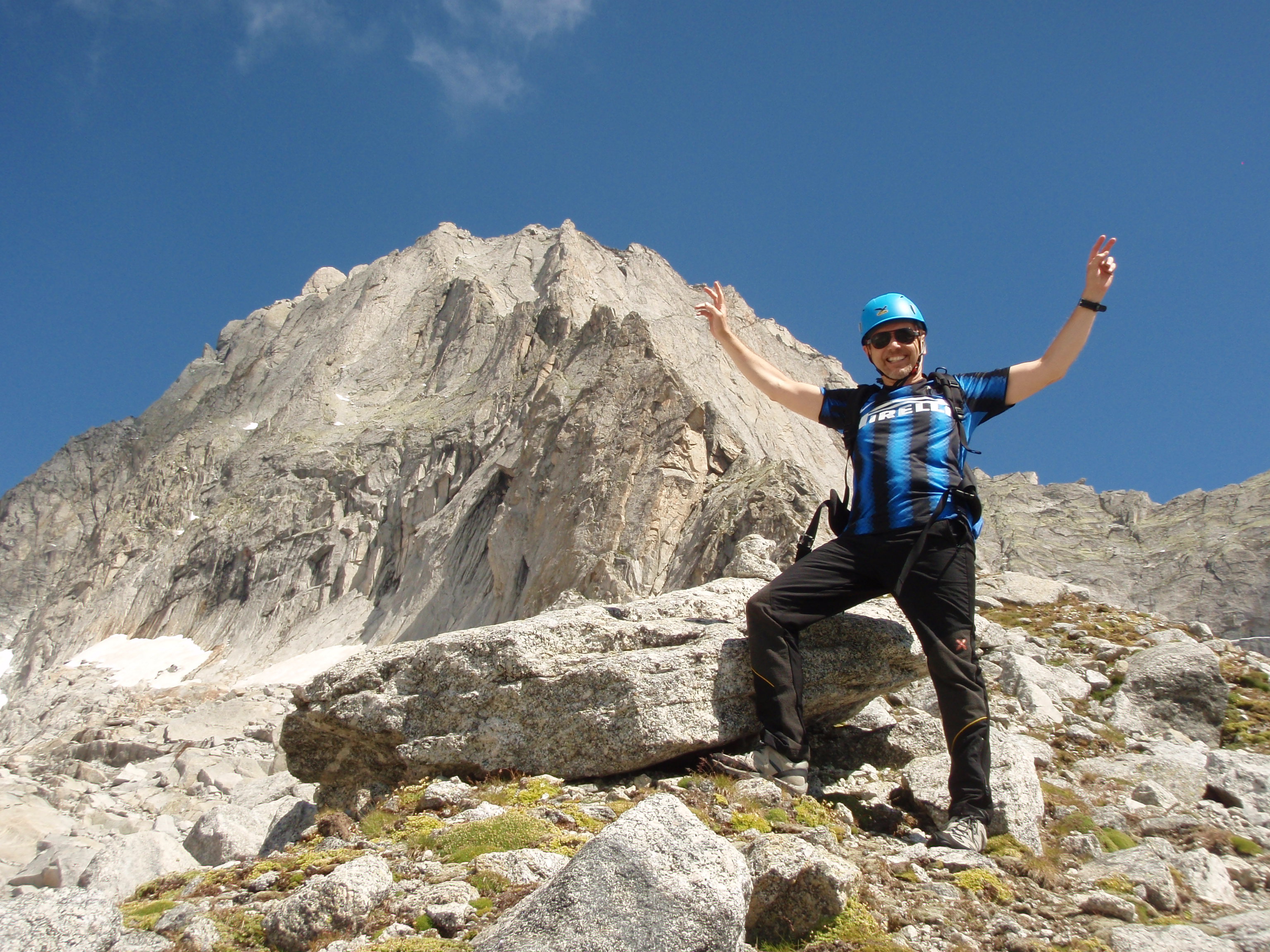 Viste da lontano le pareti del Badile sembrano muraglie inaccessibili. Sul lato meridionale della montagna nel lontano 1867 il reverendo inglese William August Coolidge con le sue guide individuò la linea di salita più agevole alla montagna, percorsa ieri in scioltezza in compagnia dell’amico Corrado, gran maratoneta (ben quattro corse solo nel 2010) e appassionato tifoso dell’Inter! Mic