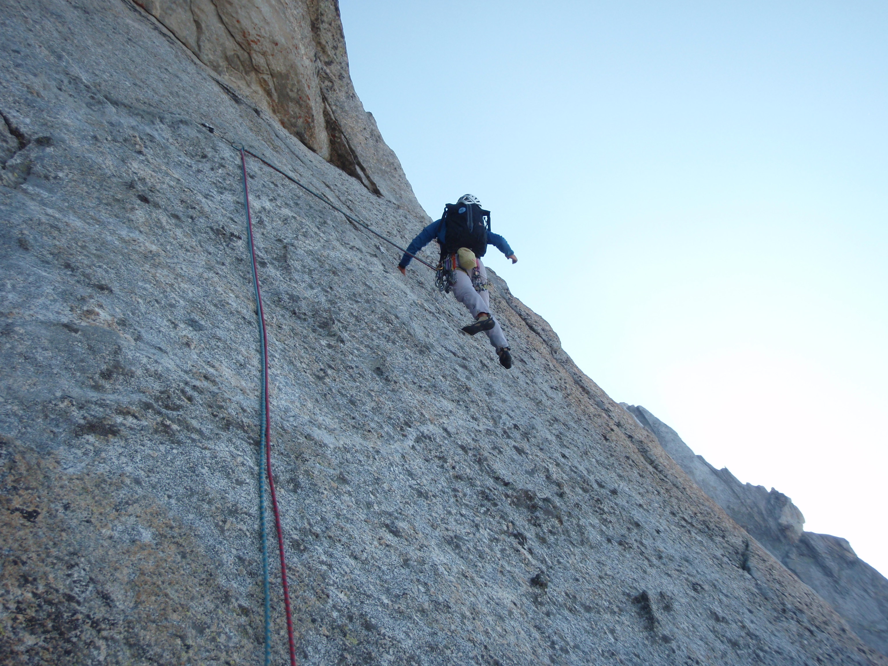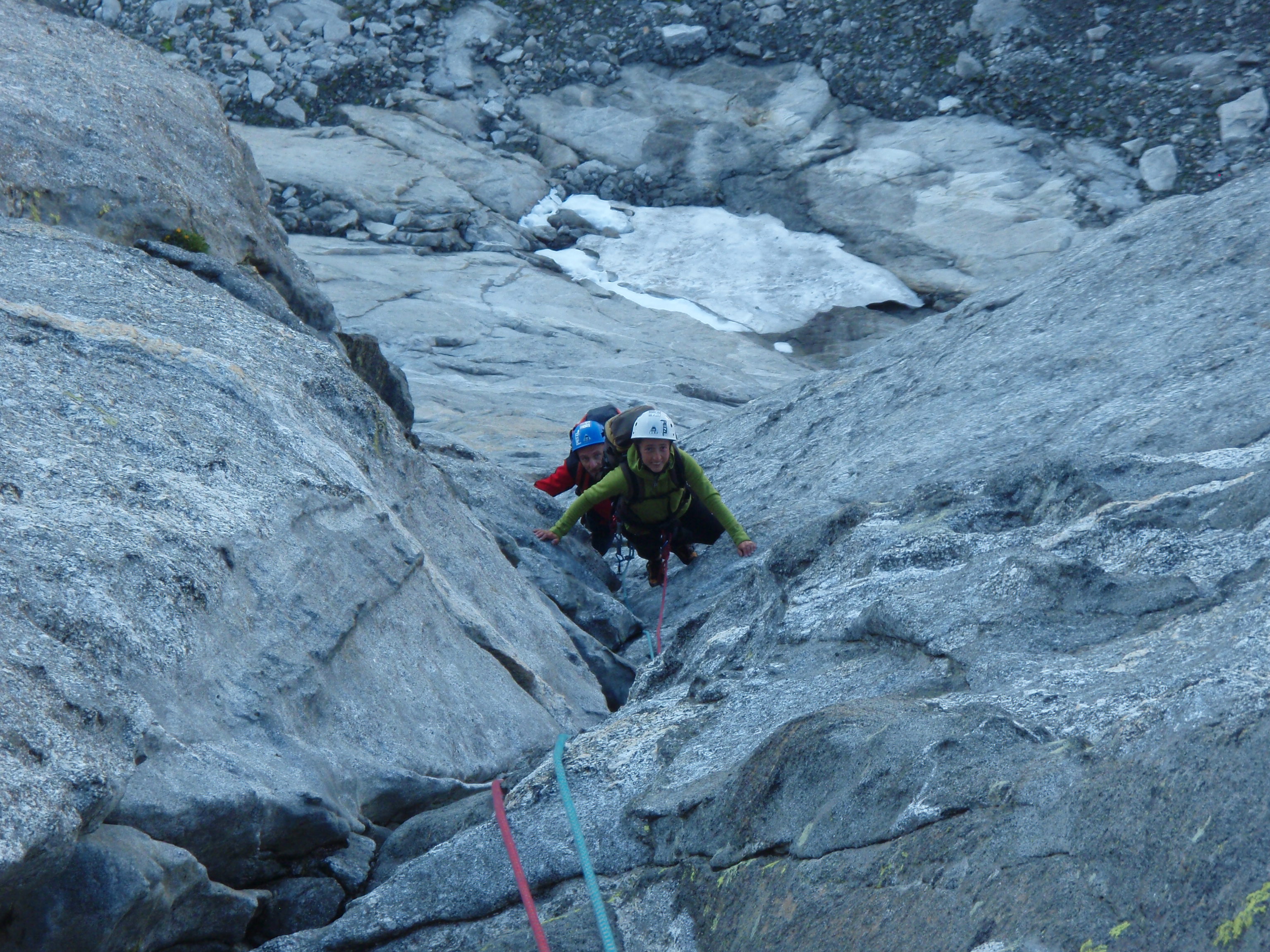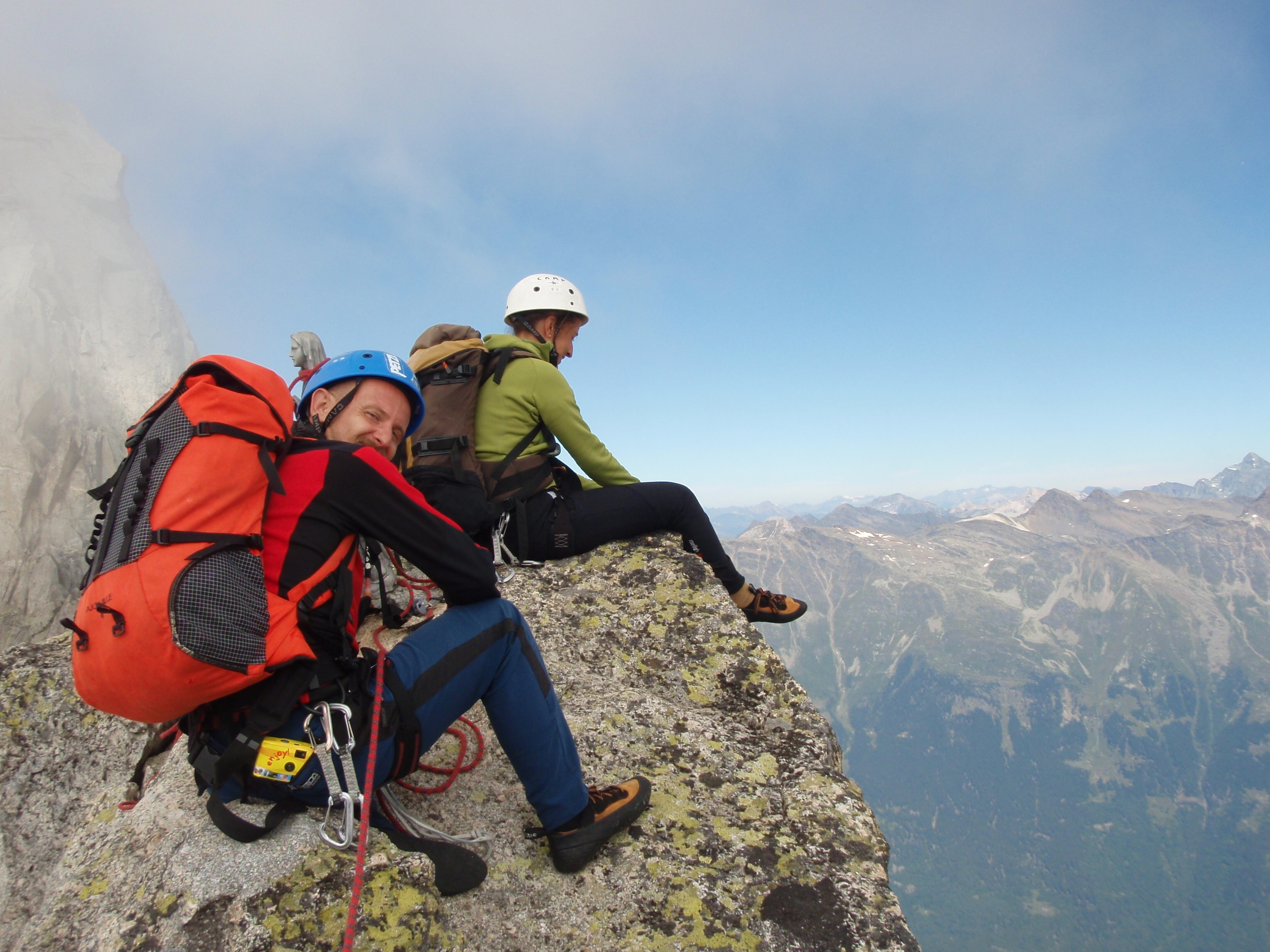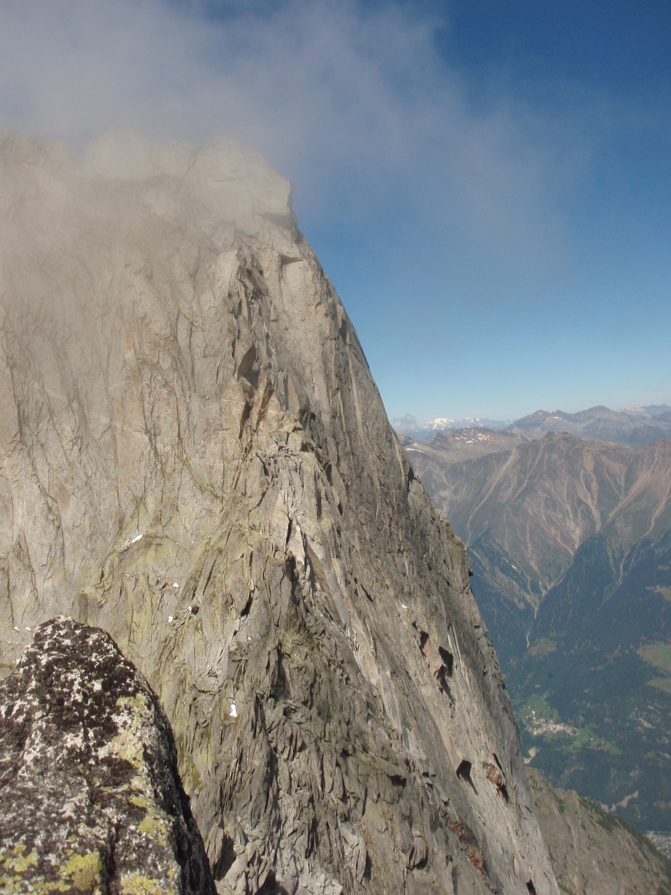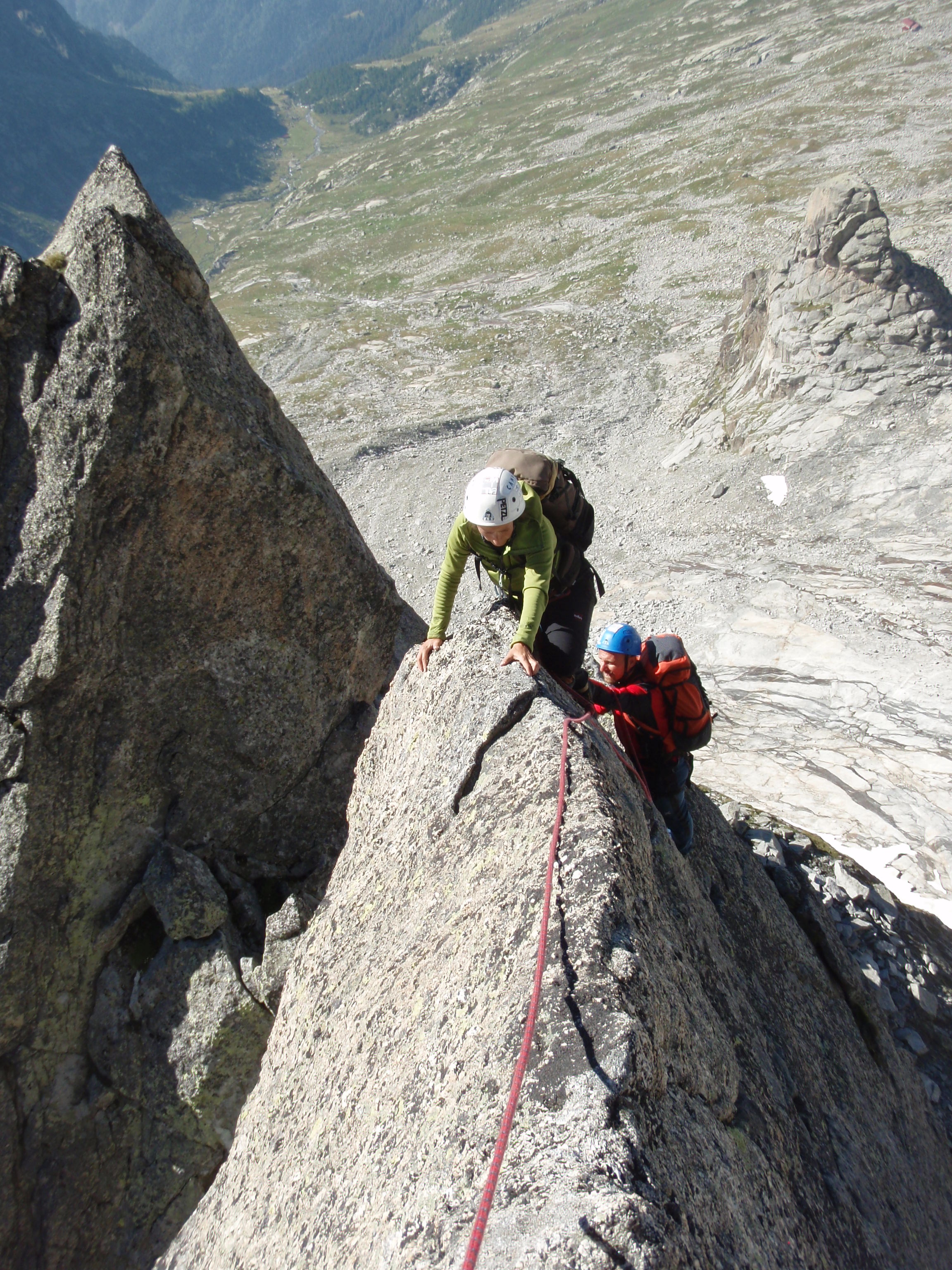 Combinando la variante Ying e Yang di sei belle lunghezze di corda con la seconda parte dell’estetica cresta Marimonti ne esce una combinazione di sicura soddisfazione, paragonabile per bellezza al vicino Spigolo Vinci. Dall’esile vetta, cavalcata agevolmente da Cris e Gra, le pareti cadono a picco sopra l’ombroso canale del Cengalo; splendida la vista sulla sterminata nord-est del Badile. Mic