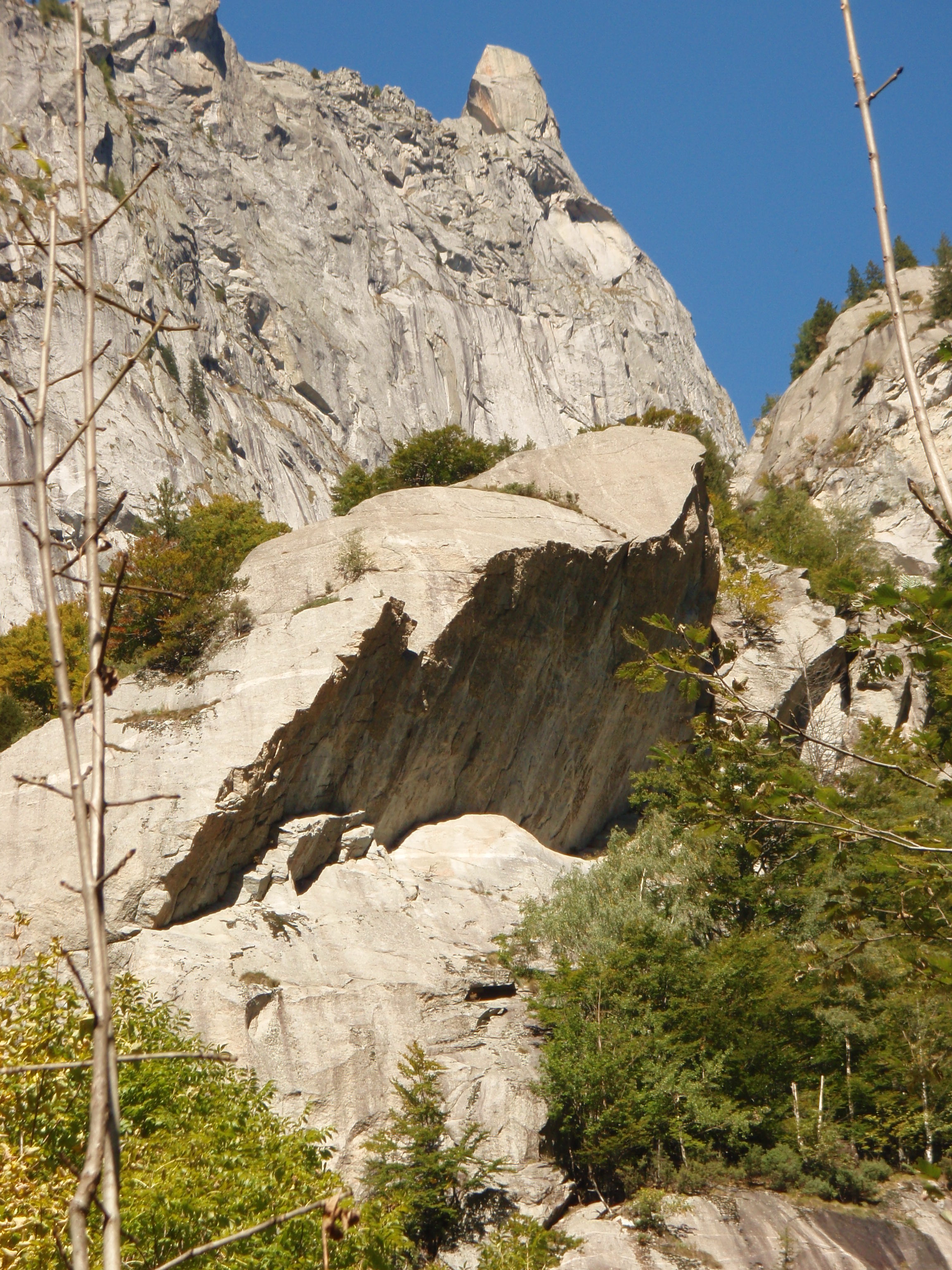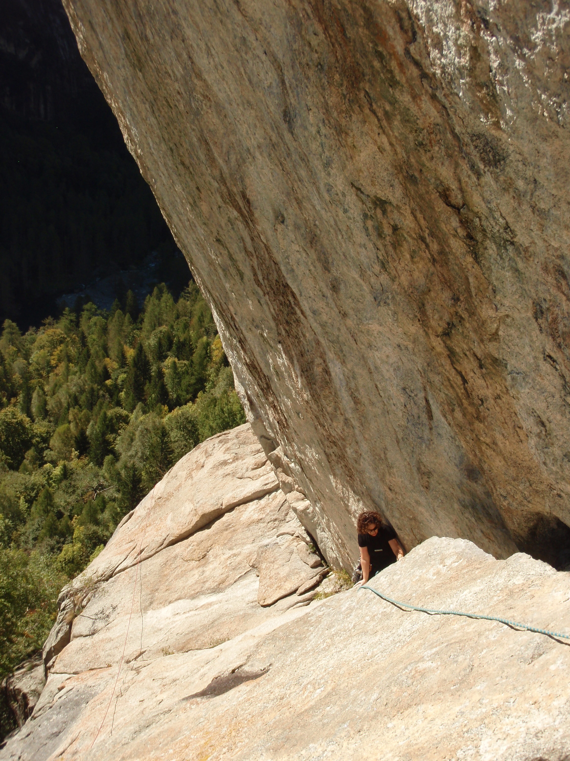 Questo è il periodo più bello per arrampicare in Val di Mello. Quando il fondovalle si fa umido e ombroso, basta raggiungere la base delle strutture illuminate dal sole e ci si trova in un altro mondo. Si arrampica con la giusta temperatura e il miglior “grip”, l’aria è tersa e i colori dell’autunno rendono il tutto ancor più gradevole. Un divertente condensato, non troppo impegnativo, dell’arrampicata mellica si può trovare lungo la storica placca dello Stomaco Peloso, da combinare con la soprastante via Alba del Nirvana. Mic