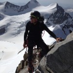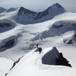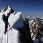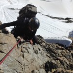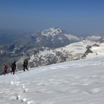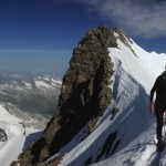 La neve è cedevole e si affonda sin dalle prime luci dell’alba risalendo il ripido canale di Cresta Guzza che porta alla Capanna Marco e Rosa, il più alto rifugio di Lombardia. La giornata è magnifica, ma l’assenza di gelo notturno anche a quote elevate rende la marcia più faticosa del solito. Dante, esploratore di luoghi lontani e trailrunner di lungo corso segue senza affanno, concentrato ed attento ad ogni passo. La cresta è affilata e sinuosa ed è piacevole superare il risalto roccioso sotto la vetta italiana scalando su una diorite insolitamente calda e piacevole al tatto. Meglio trovar rifugio sulla roccia nei prossimi giorni, in attesa che un po’ di fresco rinsaldi neve e ghiaccio.
