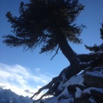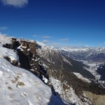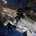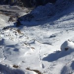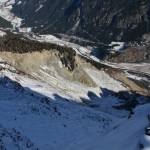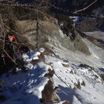Dall’Alpe Zandilla il sentiero piega verso sud, tra boschi radi e distese di rododendri che spuntano dalla poca neve caduta nei giorni scorsi, con la superficie ricoperta da grossi cristalli di brina di superficie. Superiamo alcuni ruscelli gelati, seguendo i camminamenti dei selvatici, con fresche tracce di lepre bianca e ungulati, spingendoci verso il coronamento della frana. Ad un tratto il sole illumina il bosco e dopo pochi passi si apre la grande voragine che sovrasta la valle dell’Adda, posta mille metri più in basso. Risaliamo per intero il bordo della nicchia superiore, stupendoci di fronte alla tenacia di un vecchio pino mugo, sospeso e sporgente sul bordo dell’abisso, aggrappato solo con parte delle radici alle rocce. Dall’alto, dalla panoramica zona di vertice, osserviamo l’area di distacco, l’estesa superficie di scivolamento e il caos di scisti, gneiss e depositi che precipitarono in pochi istanti il 28 luglio 1987 alle 7.23 del mattino, con volumi imponenti (33 milioni di metri cubi) e causarono un impatto sul lago creatosi nei giorni precedenti a seguito di una piena, tale da innescare un’onda di fango e pietre che risalì la valle fino all’abitato di Aquilone e provocò la morte di 27 persone.