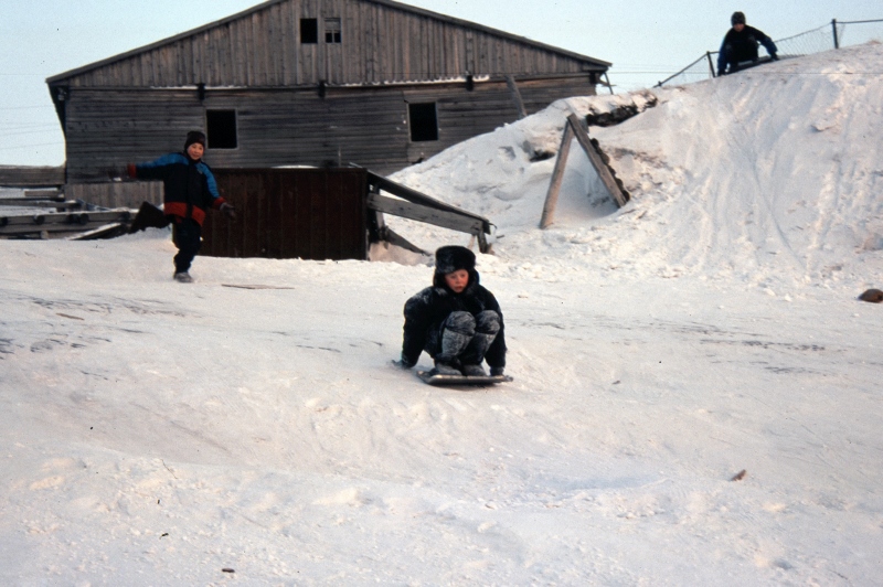 Nella foto: bambini siberiani fanno “snowboard” a -30° (Khatanga, 71° 59′ N 102° 30′ E aprile 2001)