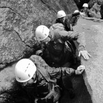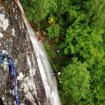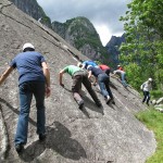 Sole e pioggia si susseguono nel giro di poche ore, l’erba nei prati sembra crescere a vista d’occhio. Potenti scrosci si alternano a brevi schiarite e nel volgere di pochi istanti il cielo cupo si trasforma e la luce assume incredibili tonalità, riflettendosi sulle rocce bagnate. Il sottobosco zuppo d’acqua esalta gli odori di legno, muschio, corteccia e granito. Distese di felci verde brillante contrastano con piccole e gustose fragole rosse appena mature. Riusciamo ad arrampicare e scendere in corda doppia nel vuoto dal “grande grigio”, ma soprattutto a sentire, ancor prima di sapere.