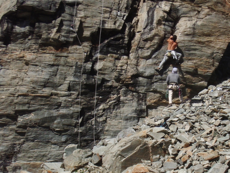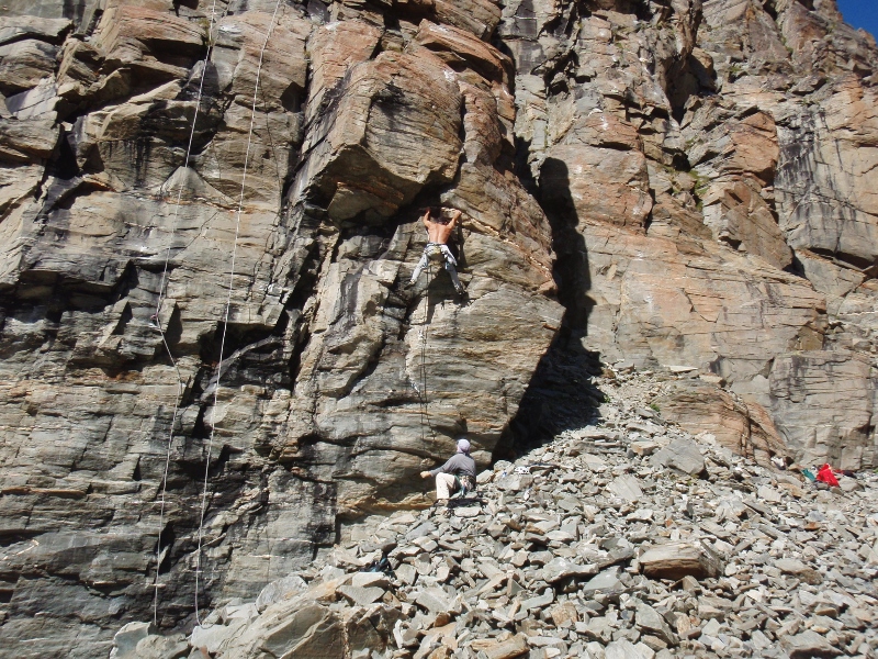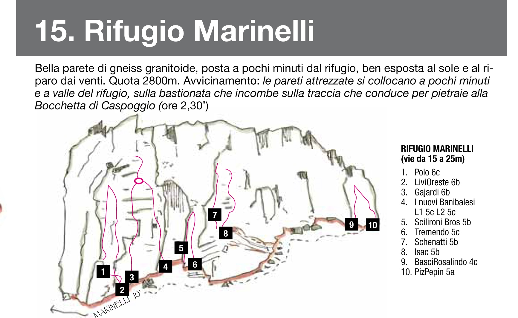 Quando il caldo rende impossibile scalare a fondovalle non resta che salire di quota. La parete per l’arrampicata sportiva più alta della Valmalenco (2800 m) si trova a pochi minuti dal rifugio Marinelli, su un vasto contrafforte roccioso, che sovrasta la traccia di sentiero che conduce alla bocchetta di Caspoggio. L’attrezzammo anni fa, assieme Popi Miotti e Paolo Masa, su iniziativa del CAI Valtellinese. Le vie sono in stile “granitico”, per fessure e diedri, ben esposte al sole e al riparo dei venti da nord. Ricordatevi di mettere corda, rinvii e un paio di pedule nello zaino alla prossima escursione al rifugio.