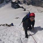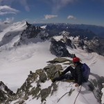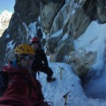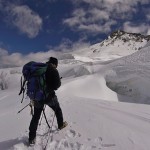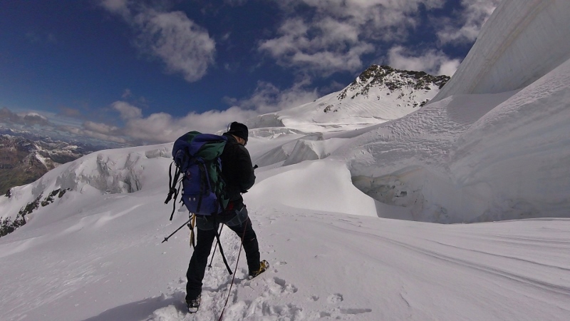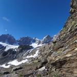 Le rocce che bordano il canale di Cresta Vento Guzza sono incrostate di ghiaccio, la brezza vivace da nord da un sapore quasi invernale alla salita. Nubi sfilacciate dal vento si rincorrono e si disperdono oltre il Bellavista, sopra il deserto bianco del plateau di Fellaria.