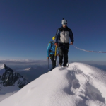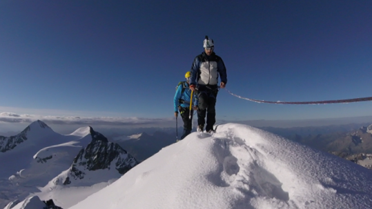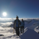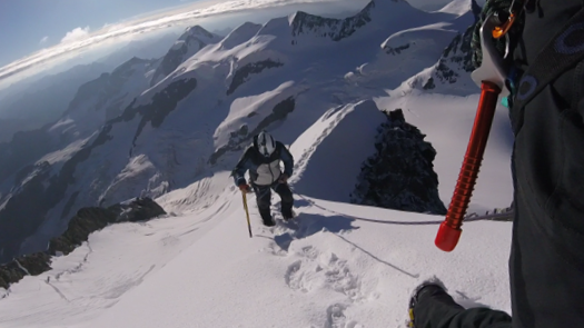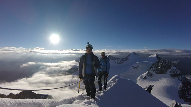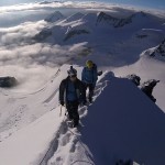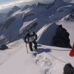 Battiamo la traccia  nella neve pallottolare portata dalla tempesta di ieri sera. Siamo i primi a risalire la spalla del Bernina stamane. Con il sorgere del sole le nebbia si dissolve e l’aerea cresta sommitale è tutta per noi.