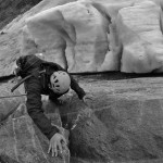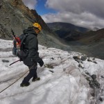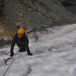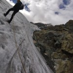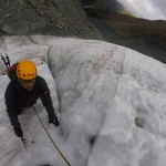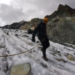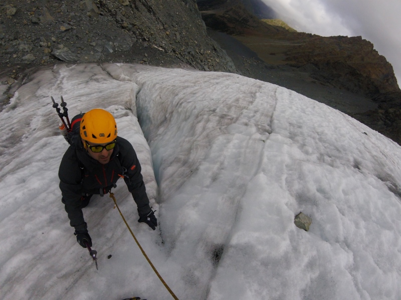 Risaliamo estese placche di serpentinite simili a grandi dorsi di balena appena liberate dal ritiro dei ghiacci. Sono costellate di piccole scanalature multiple, diritte e parallele, formate dalla frizione tra i ciottoli trasportati alla base del ghiacciaio che agiscono come utensili da taglio e la roccia sottostante.  L’odore ai margini del ghiacciaio in estate è inconfondibile, sa d’acqua di fusione, di limo, di roccia nuda. La superficie è in parte ricoperta da detrito e profonde bédières solcano il ghiaccio fin verso la fronte. Lungo il fianco sinistro, tra rari crepacci longitudinali, troviamo un’alternanza di pendii che ben si prestano al “cramponnage”, la tecnica di progressione con i ramponi punte a piatto. Prima dell’avvento delle punte frontali era il normale modo di procedere e anche oggi è una tecnica che non va  dimenticata, anche con i ramponi più tecnologici. Lungo itinerari di alta montagna e con pendenze non estreme il risparmio di energia è notevole rispetto alla tecnica frontale e questo permette di salire agevolmente, con maggior efficacia, risparmiando caviglie e polpacci.