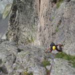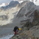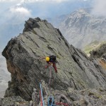 A volte le salite migliori nascono per caso. Partiti con una vaga idea di ripetere una vecchia via degli anni ’70 sulla parete sud est, ci ritroviamo senza relazione e con solo una manciata di protezioni veloci a vagare senza pensieri, né ambizioni, per la parete sud, scovando una piacevole linea di stampo alpinistico che alla fine ci porta sull’affilata cresta sommitale con vista sui ghiacciai del Bernina.