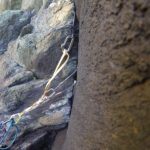 Oltre nessuno spit, nessuna sosta, solo le pieghe naturali del serpentino indicano la via. Una corda da 50m, un mazzo di nut, quelche friend e un paio di fettucce da strozzare attorno a piccoli larici bonsai che si trovano in parete sono il materiale occorrente.