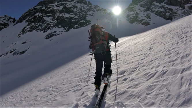 Siglare la neve con linee e curve che si adattano alle forme della montagna significa disegnare ciò che appassiona. Così la spigolosa traccia di salita merita d’esser lasciata intatta, non intersecata dagli archi di curva della discesa che s’allargano ad abbracciare l’immacolato alto bacino del ghiacciaio del Ventina.