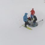 La bufera si alza all’improvviso. Per ripararci dalle raffiche potenti troviamo riparo all’interno di una curiosa depressione conica nella neve che mette a nudo la superficie gelata del lago.