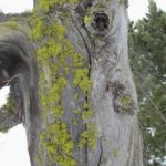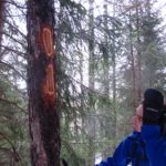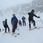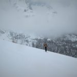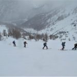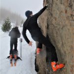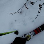Qui le nuvole basse non lasciano spazio alla noia. Si passa di sorpresa in sorpresa: impronte di gallo forcello, il dormitorio del picchio, rocce brune per arrampicare, larici solitari, turbini di fiocchi di neve, licheni “fluo” agrappati a tronchi secolari, white out totale e una neve prima crostosa poi fradicia che non ci fa fare una curva ma insegna un sacco di cose.