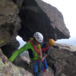 Attrezziamo la doppia su uno spuntone, scendiamo.