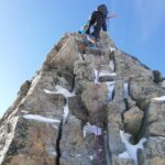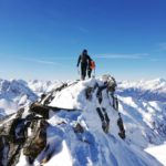 A fondo valle abbiamo trovato neve morbida, ma già salendo i primi pendii, su una traccia fatta da una coppia di escursionisti davanti a noi, ci siamo accorti che nei punti esposti al vento la neve nuova era stata spazzata via ed era già “emersa” quella vecchia, invece in piccoli avvallamenti o canalini si era accumulata in buona dose la nuova neve. Proseguendo, la coppia davanti a noi ha preso un altra direzione, mentre noi abbiamo puntato alla nostra cima. Ci siamo trovati davanti a una montagna completamente selvaggia, senza nessuna traccia. Assistiti dal bel tempo abbiamo preso la direzione consigliata dalla relazione, cioè un ripido pendio esposto a nord. Salendo ci siamo resi conto del fatto che era molto difficile proseguire con quella pendenza ma soprattutto con la quantità di neve che si era accumulata (non si riusciva a fare l’infilata di punta!!). Dunque abbiamo attivato il nostro senso critico davanti alla situazione e abbiamo valutato che la cosa più ragionevole fosse togliere gli sci, legarli allo zaino e procedere a piedi. Siamo andati avanti io e Andre a turno perchè essendo i più leggeri riuscivamo a compattare dei gradini senza sprofondare nella neve fino all’anca rompendo tutti gli strati. Procedendo siamo arrivati a un pianoro dove calcolavamo di poter rimettere gli sci, ma il vento aveva spazzato via tutta la neve nuova e quindi i nostri calcoli. Ci siamo trovati su una neve marmorea (difficilmente sciabile) e in un vento fortissimo che a momenti rendeva difficile la comunicazione. Quindi abbiamo deciso di lasciare gli sci in una buca al riparo dal vento (molto prima del previsto), di metterci i ramponi e procedere così fino alla base della cresta. La cresta era esposta al lato opposto al vento e quindi abbiamo avuto un momento di quiete, siamo saliti slegati, mentre, dopo una pausa di 5 minuti sulla cima, abbiamo valutato di scendere legati(abbiamo utilizzato la legatura senza imbrago che ci hai insegnato tu).