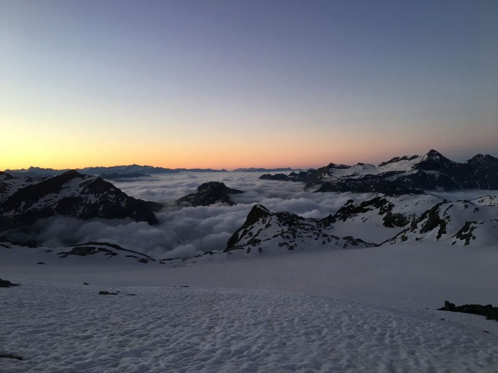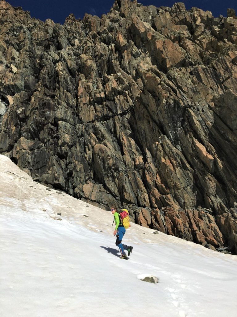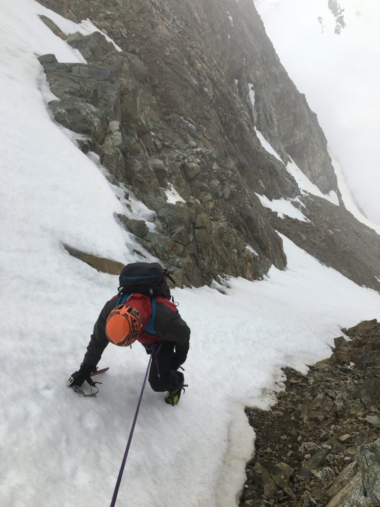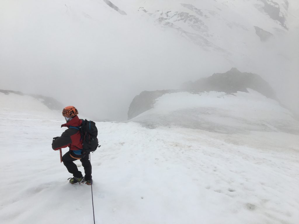 Attraversare lo Scerscen superiore nella nebbia è un piccolo bagno d’umiltà. Muoversi dentro un muro di niente, sfidando una coltre spessa quanto inesistente ci riporta con i piedi per terra.