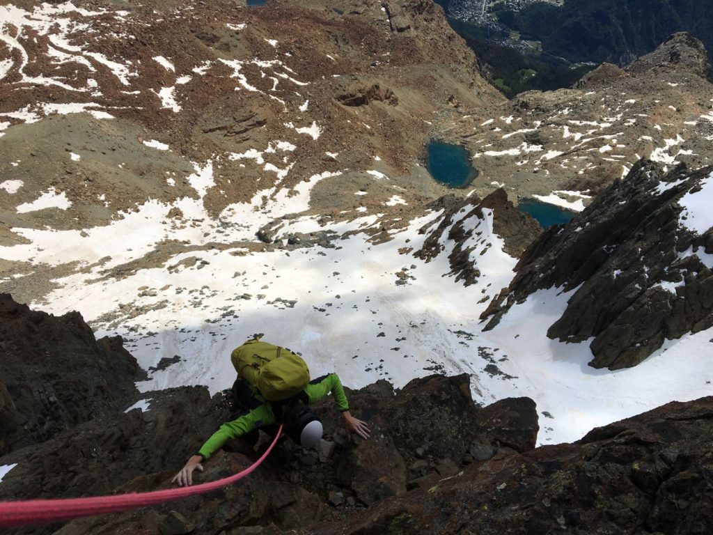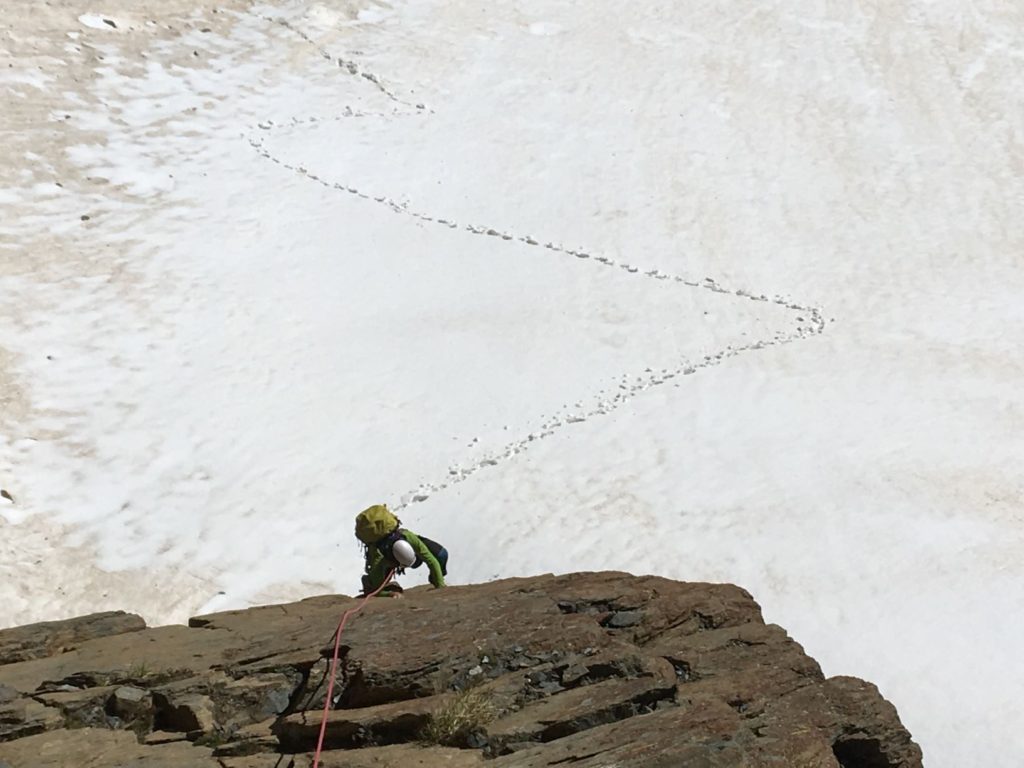Nella nebbia non si può anticipare nulla: centrare il valico nei pressi del bivacco Parravicini, il passo Sella e l’imbocco del ripido canale che si stacca da la Vadret da Sella si trasforma in un esercizio continuo dei sensi.