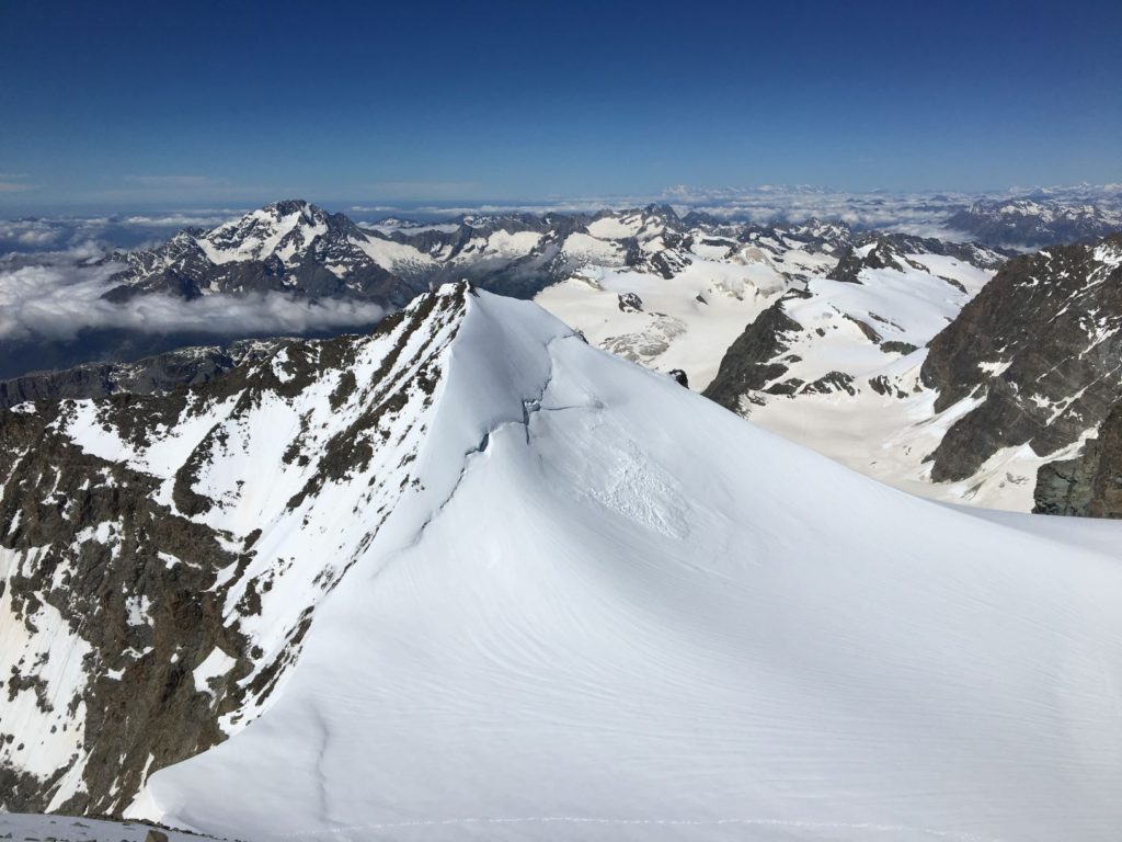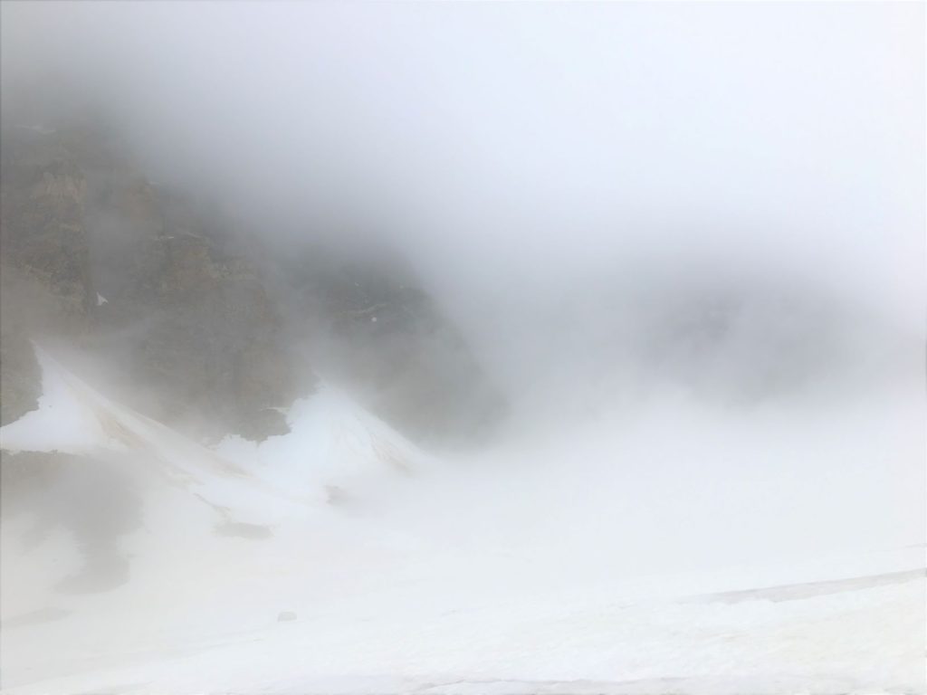 Raggiungiamo 3600m, il muro bianco persiste e la cresta sommitale non si distingue dal cielo, è tempo di rientrare.