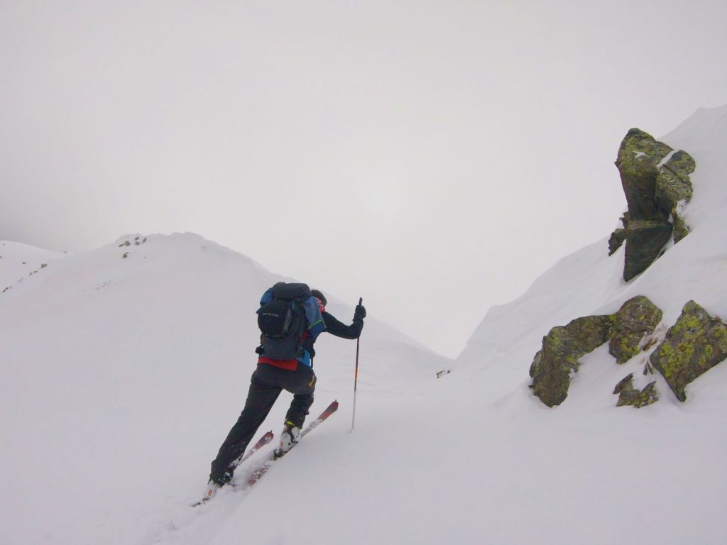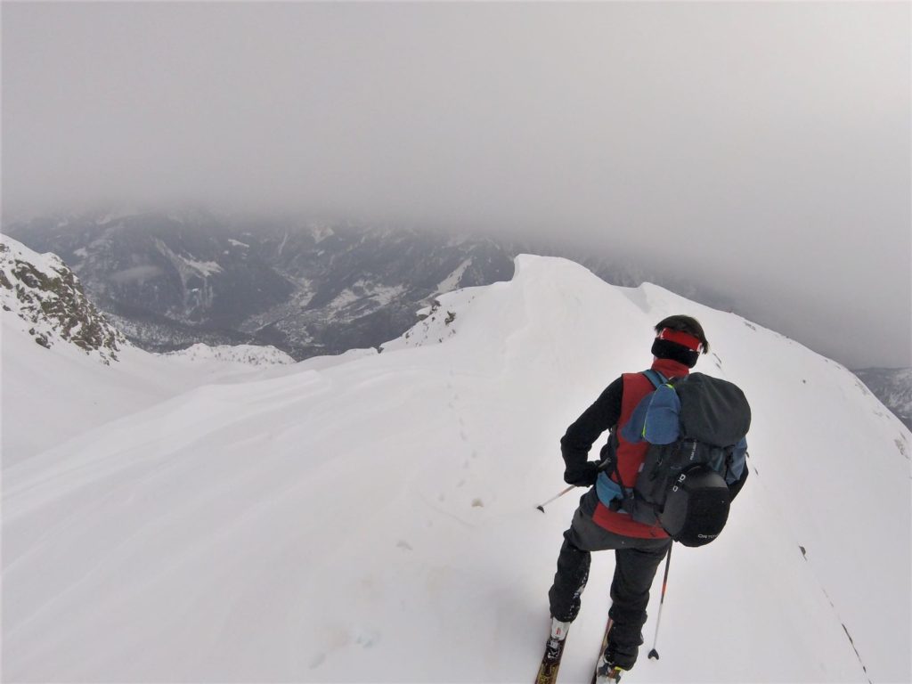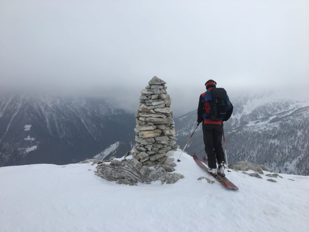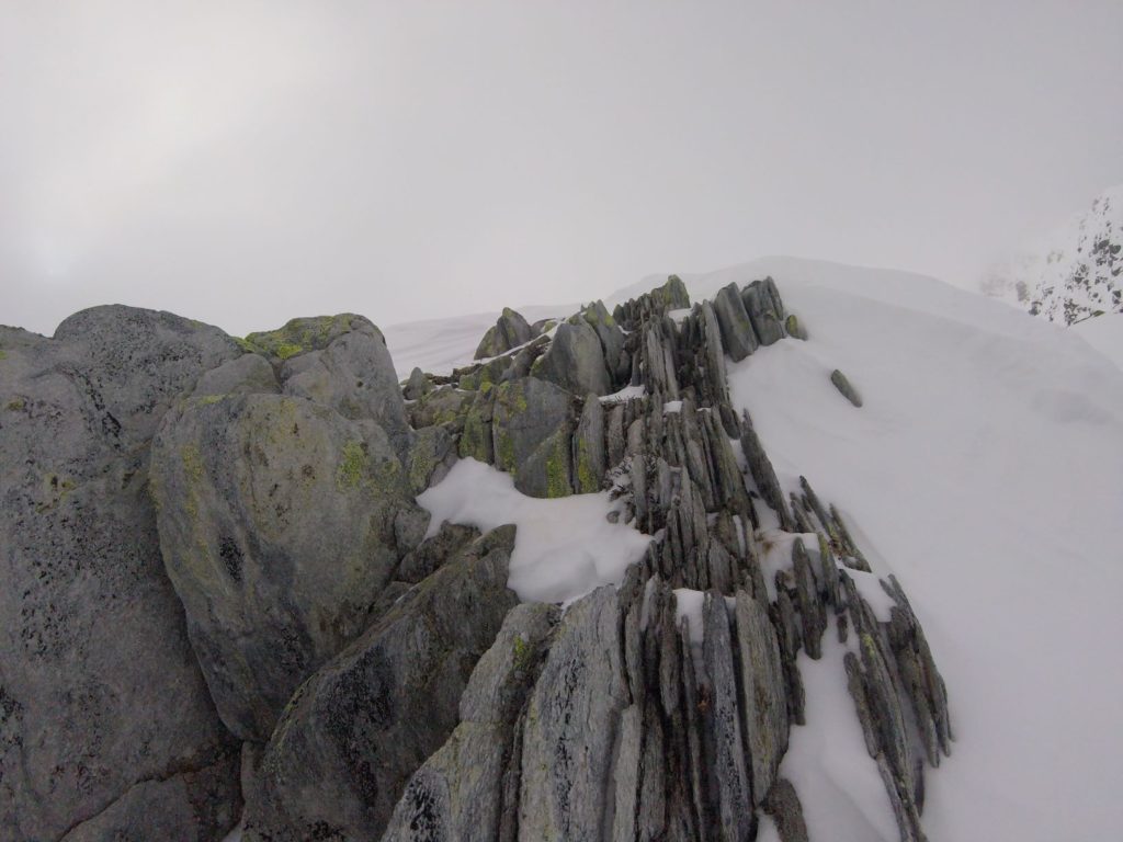 Neve ghiacciata, fumo che sa di larice, crosta di rigelo, neve ventata, neve polverosa, cornici, dorsi spazzati dal vento, brezza da sud ovest, orme di volpe al bordo della cornice, rhizocarpon geographicum che ci guida come un faro, micascisti e un grande cairn di marmi dolomitici nel punto più alto del nostro viaggio nella neve.