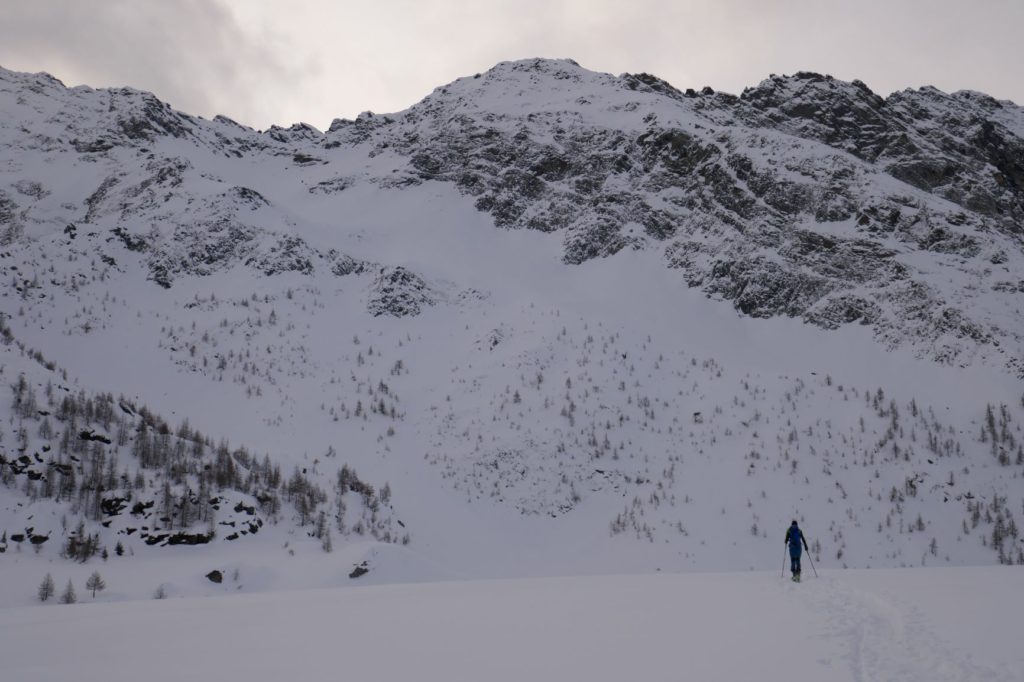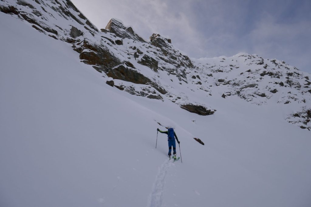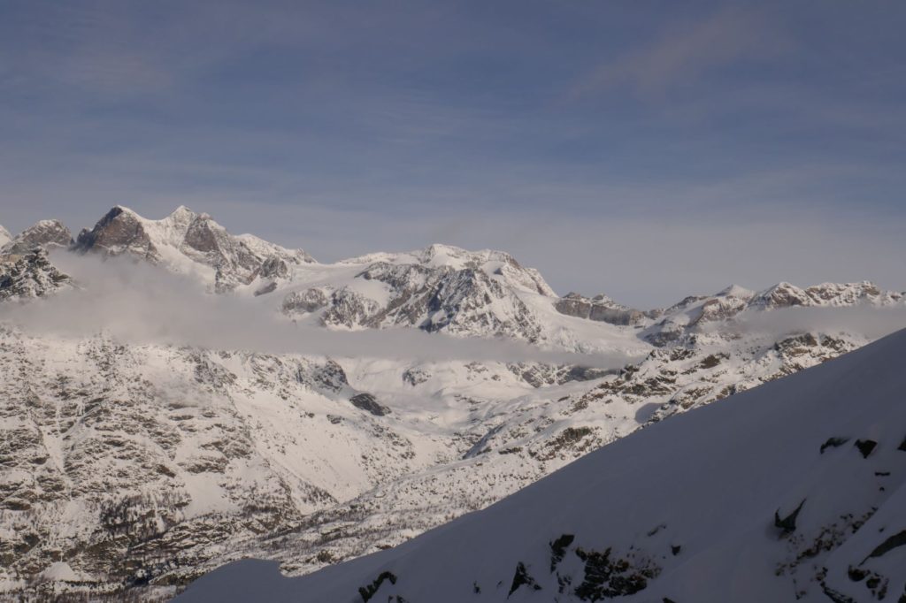 Lo strato di nubi all’orizzonte pare il coperchio della sacca d’aria umida che ristagna più in basso. Oltrepassate le nuvole, compare una brezza leggera e la neve migliora.