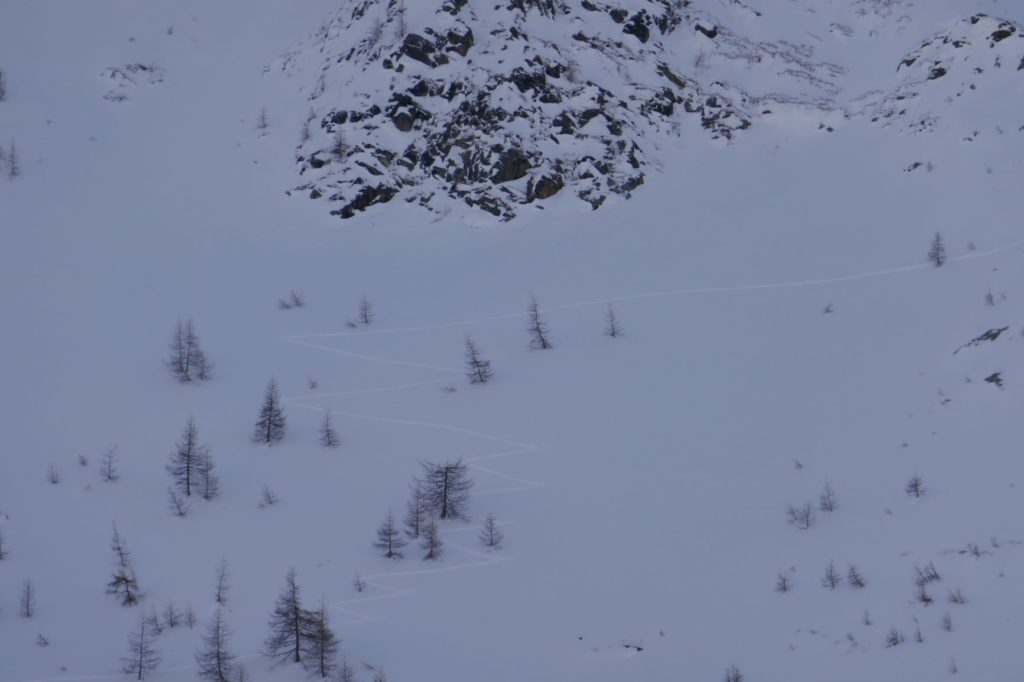 Piccoli larici bonsai guidano il nostro zigzagare in salita.