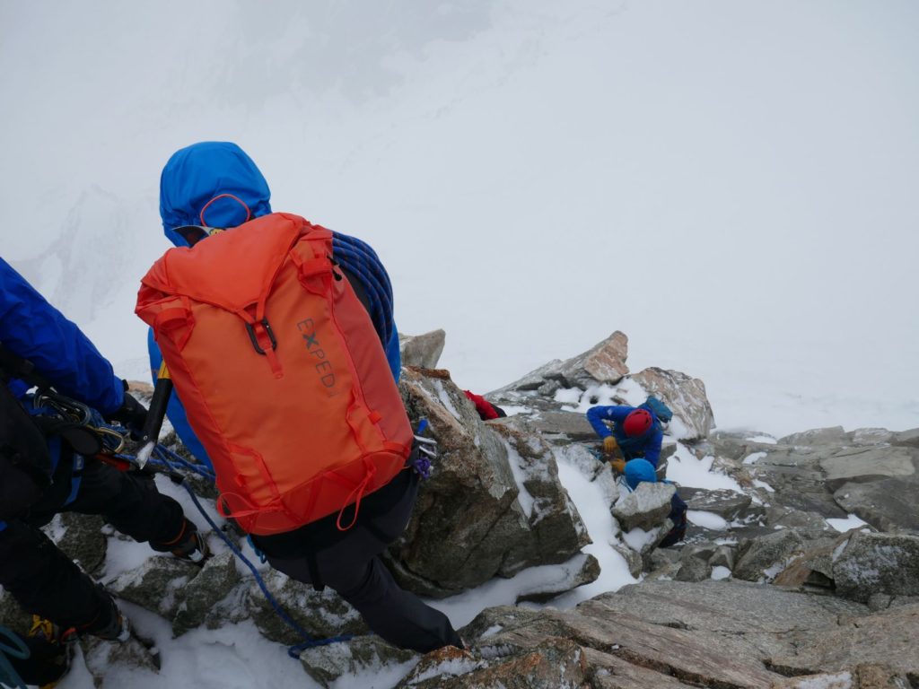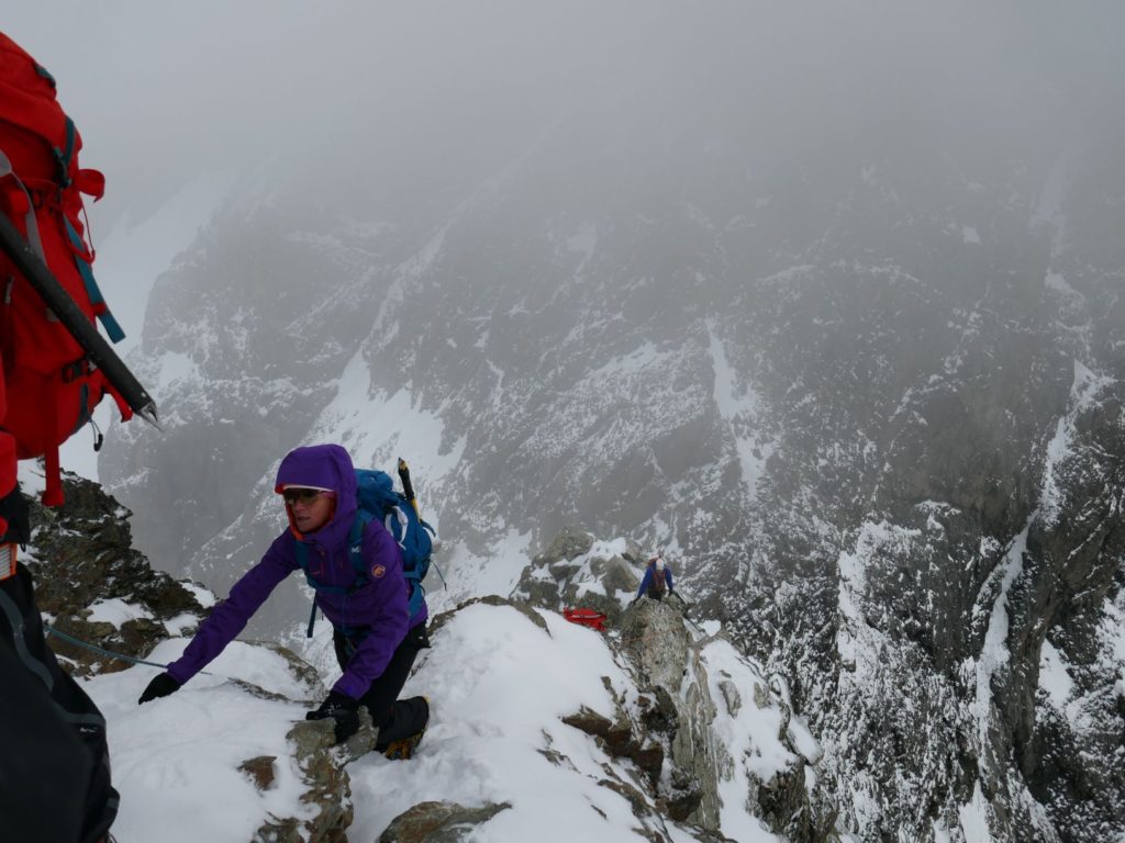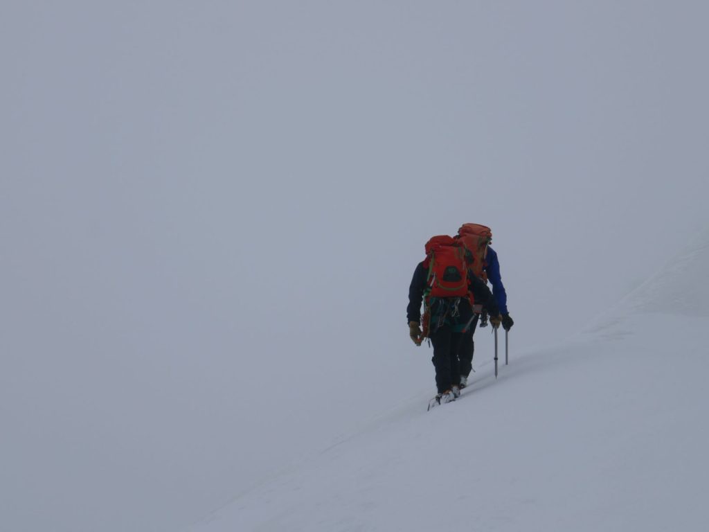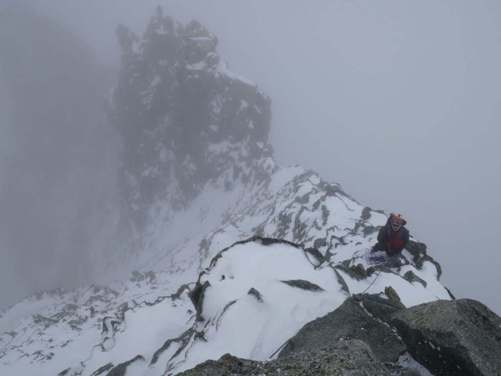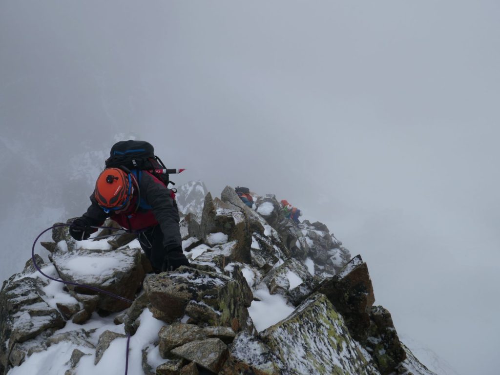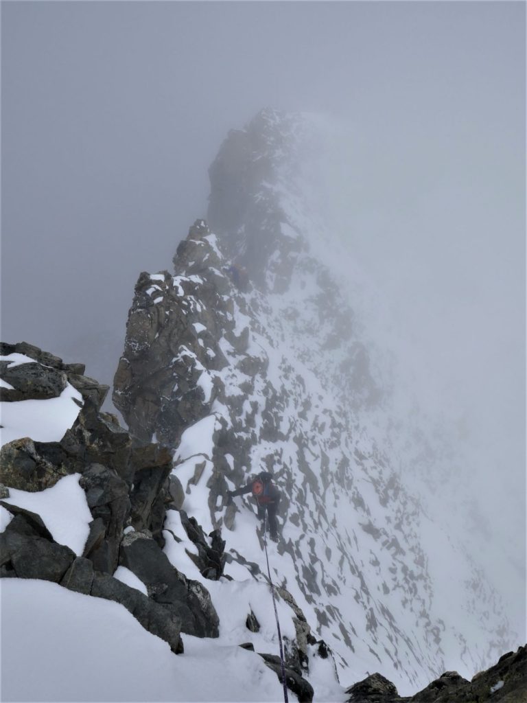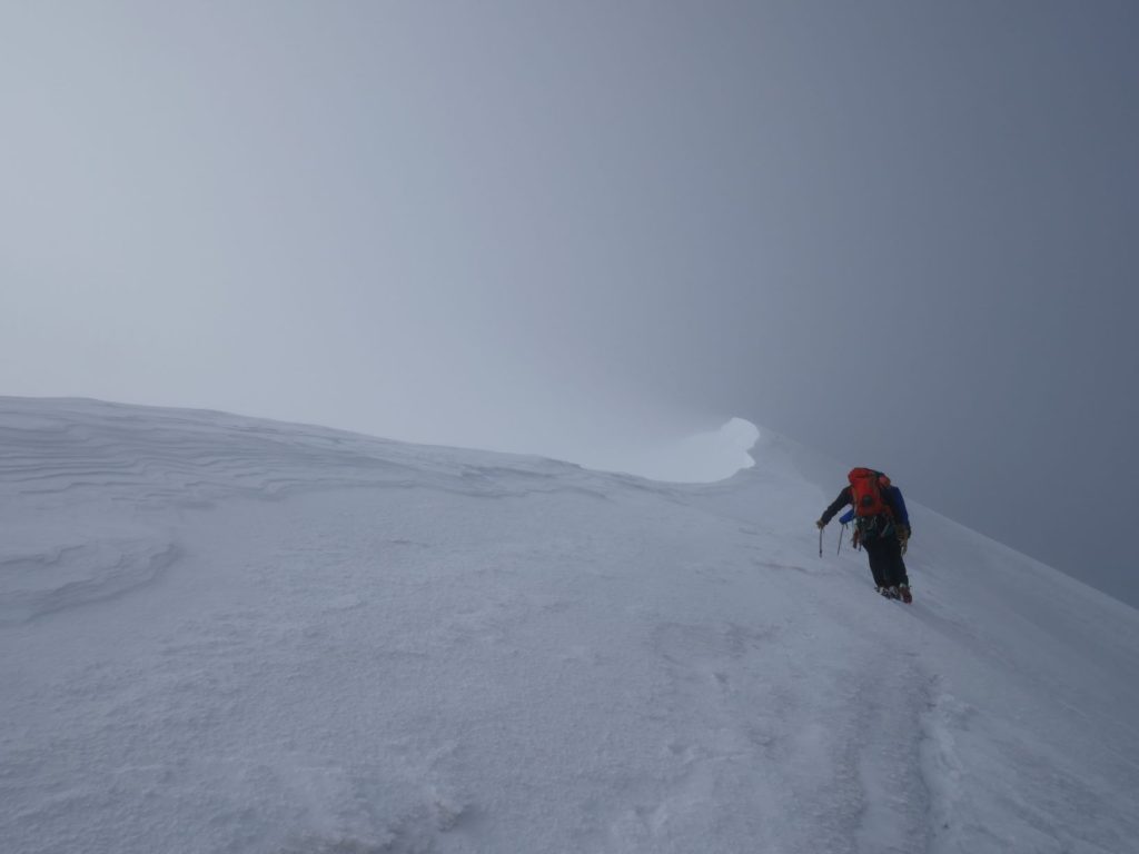 Per diverse ore esiste solo la diorite ricoperta dalla neve nuova, mentre scaliamo avvolti da sbuffi di nuvole molti metri sopra il mare.