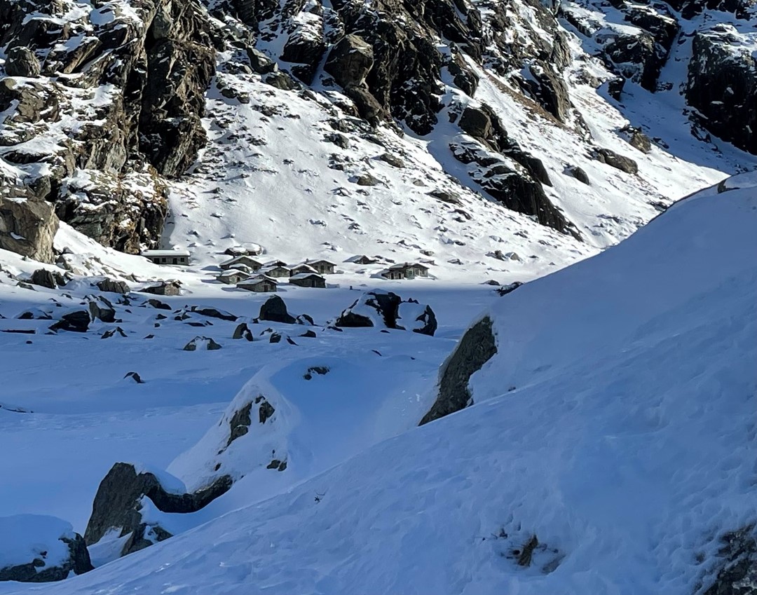 Incontriamo pianori, gibbosità, rocce rosse, canali, campi di ghiaccio, impronte di volpe, ombre fredde, tenui e scure.