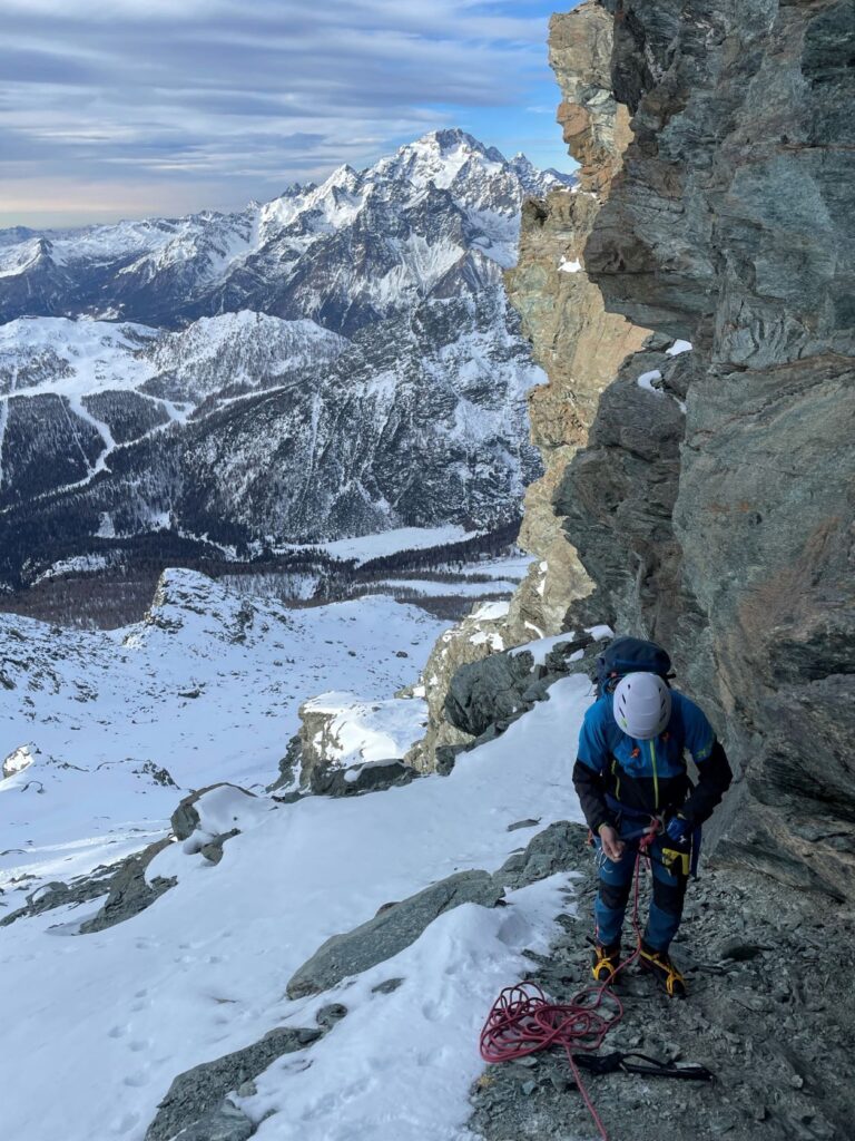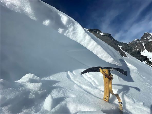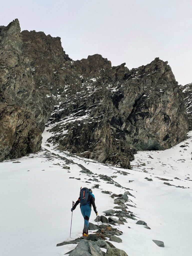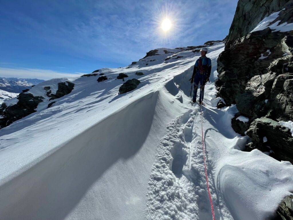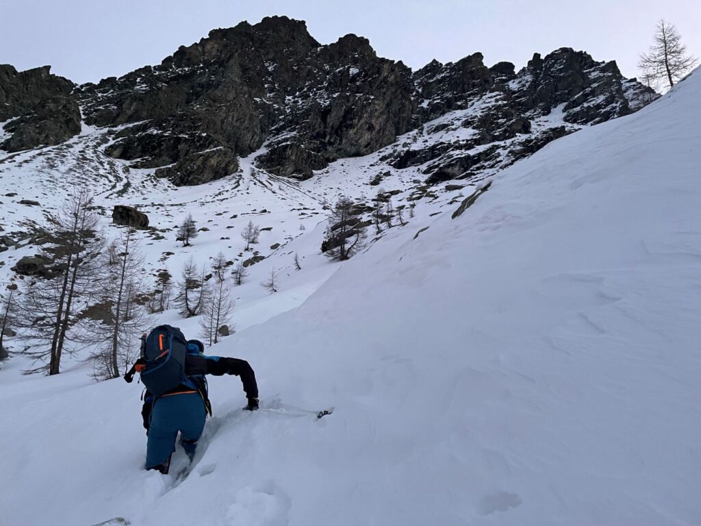 La prolungata assenza di precipitazioni invita però ad una salita alpinistica in quota lungo un canale serrato tra le rocce. Un piccolo viaggio utile a scandagliare la neve ad ogni passo. Calpestiamo pietre, erbe secche, neve farinosa, croste di rigelo, sastrugi, placche ventate, brina di superficie e brina di profondità, la cui combinazione disegna una mappa della neve che cambia ad ogni metro.