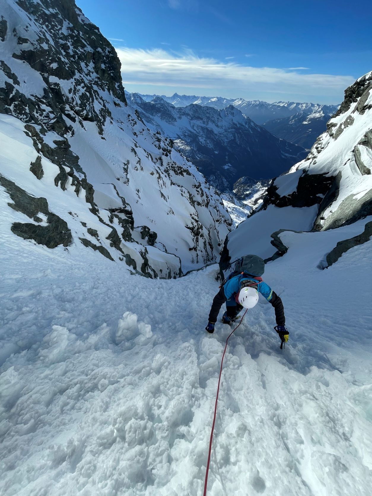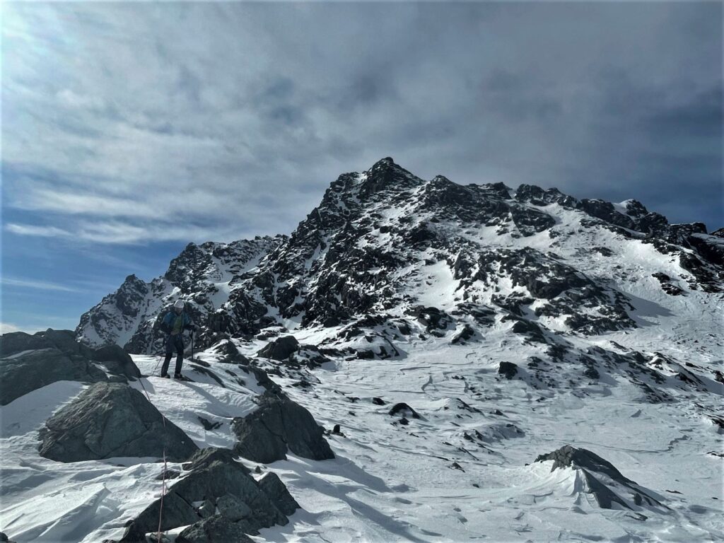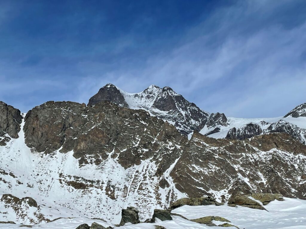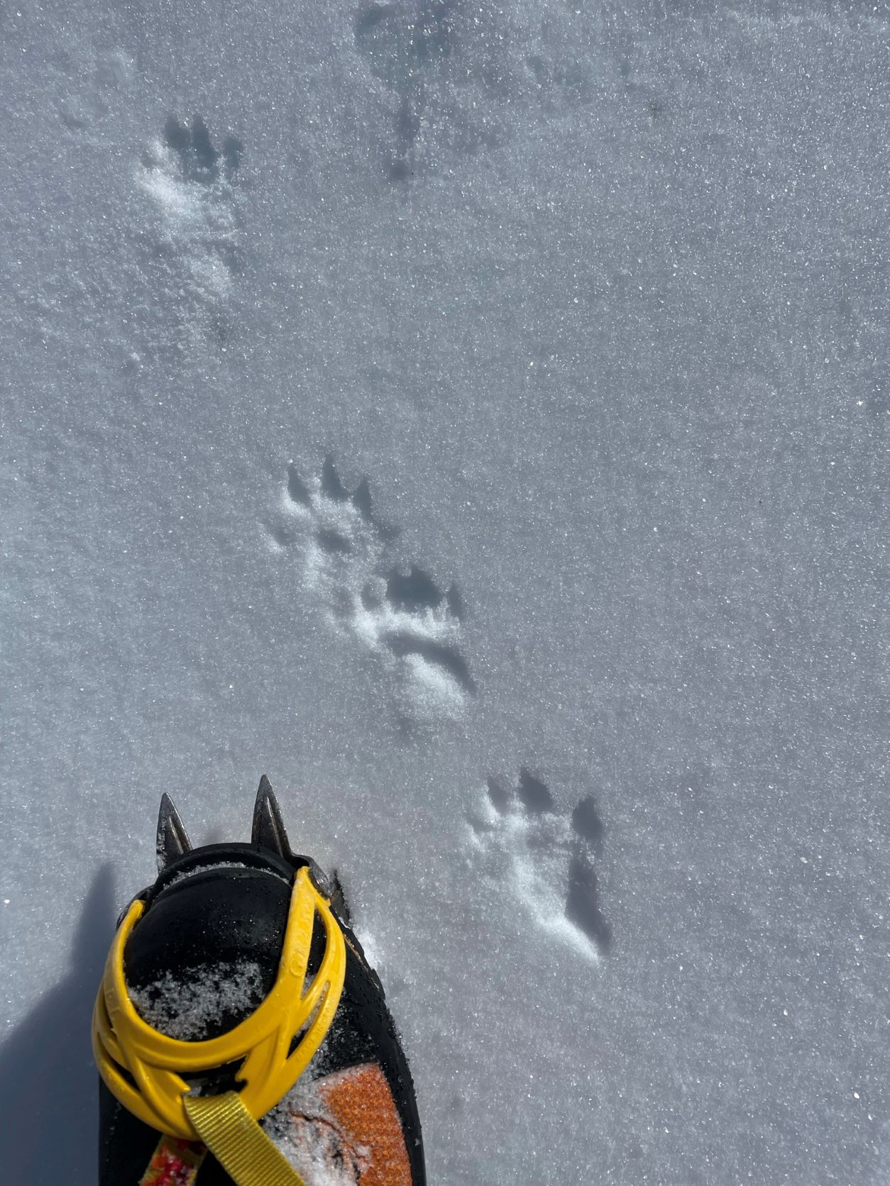 La prolungata assenza di precipitazioni invita però ad una salita alpinistica in quota lungo un canale serrato tra le rocce. Un piccolo viaggio utile a scandagliare la neve ad ogni passo. Calpestiamo pietre, erbe secche, neve farinosa, croste di rigelo, sastrugi, placche ventate, brina di superficie e brina di profondità, la cui combinazione disegna una mappa della neve che cambia ad ogni metro.