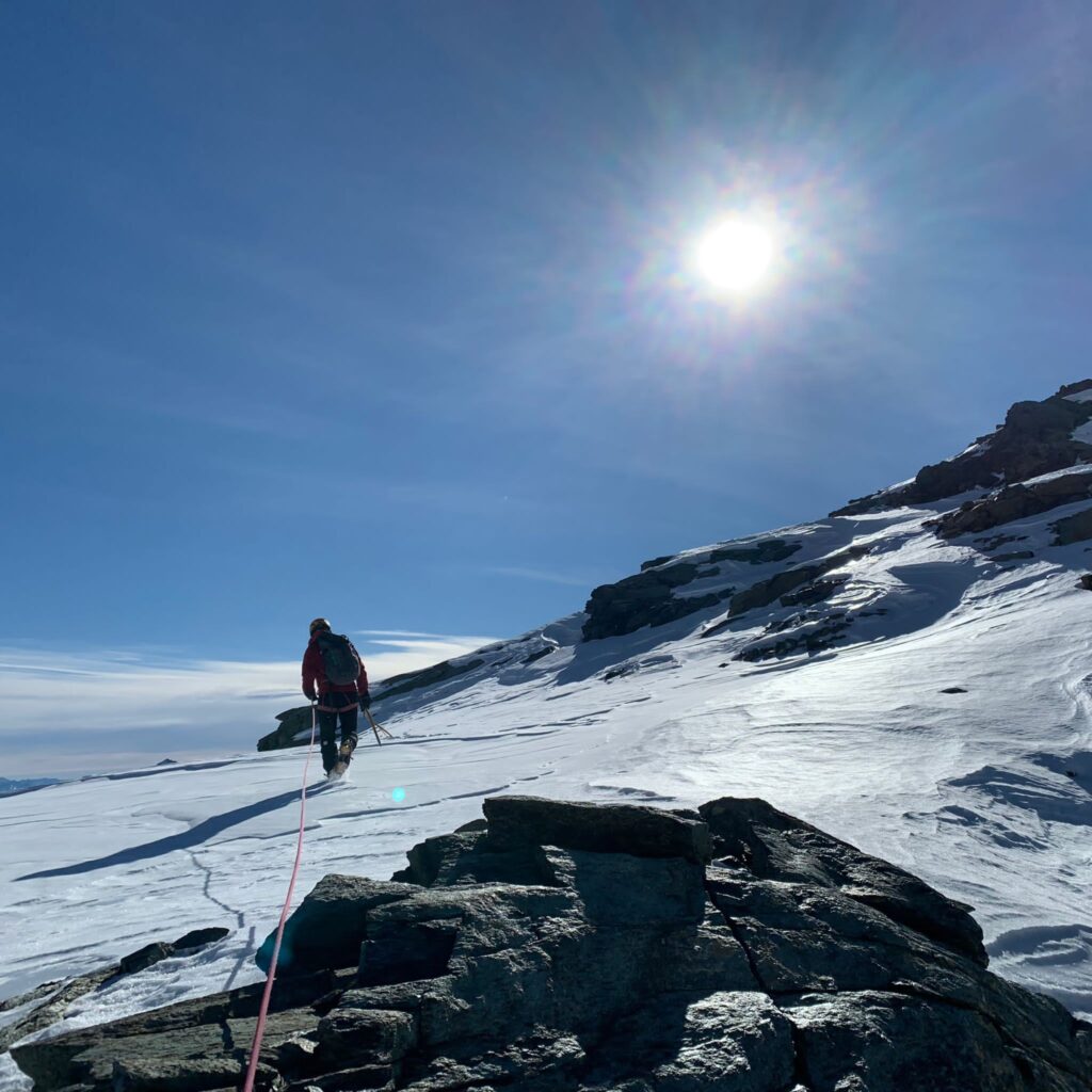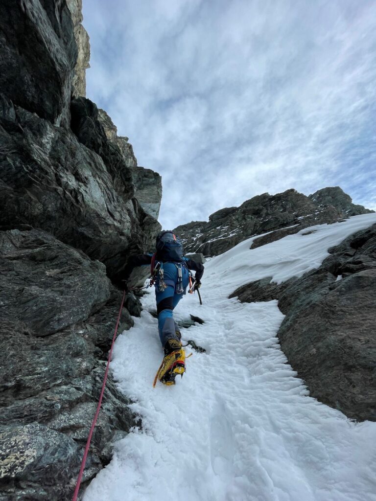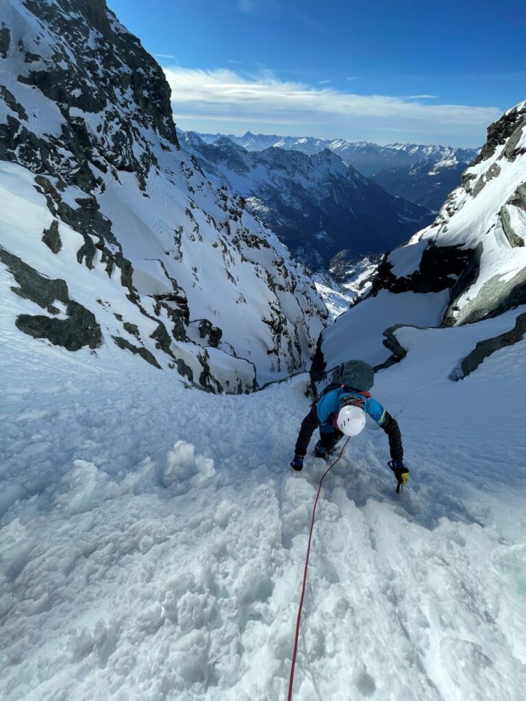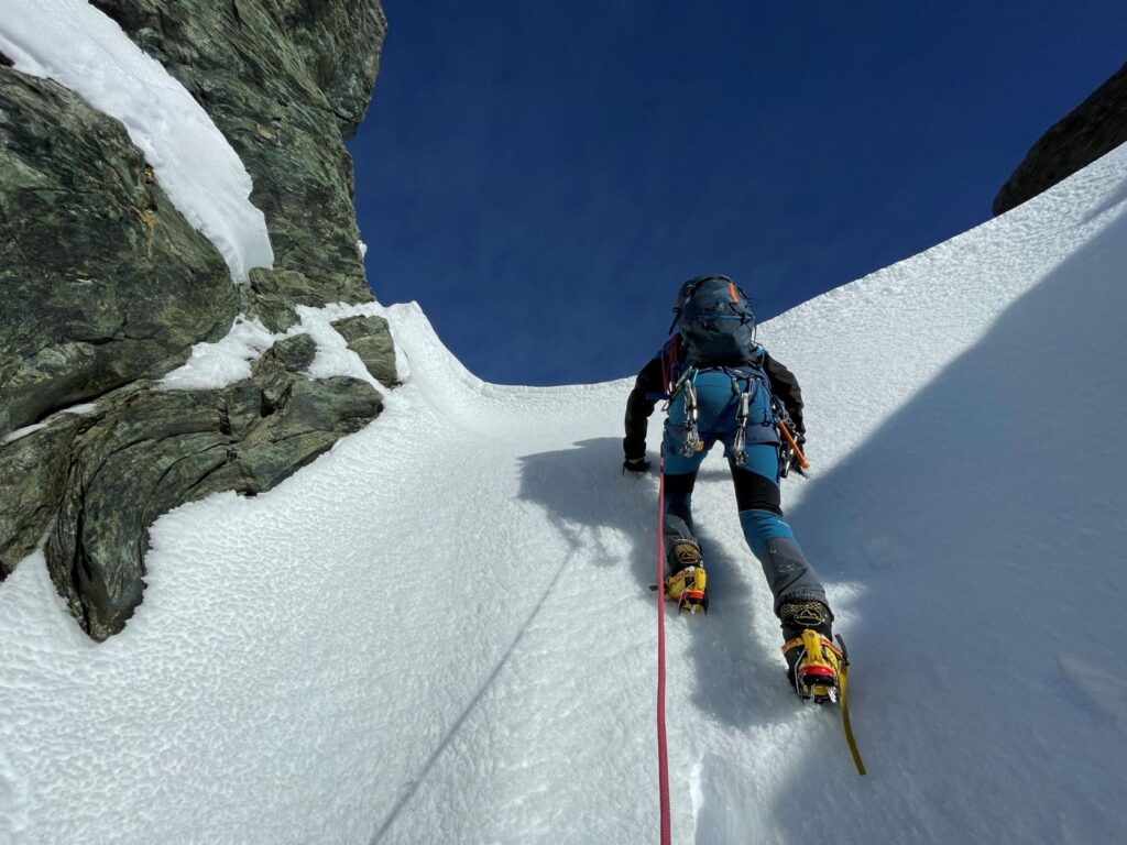 Si passa in pochi istanti dall’appoggio sulle punte frontali dei ramponi al nuoto dentro una massa bianca inconsistente.