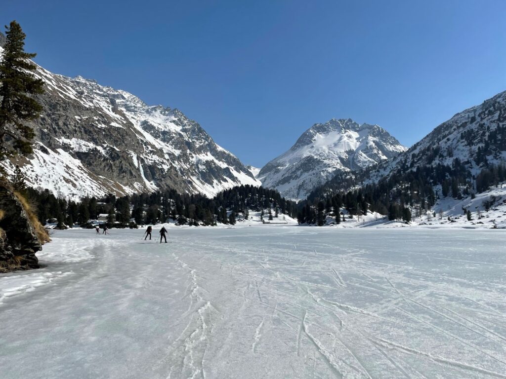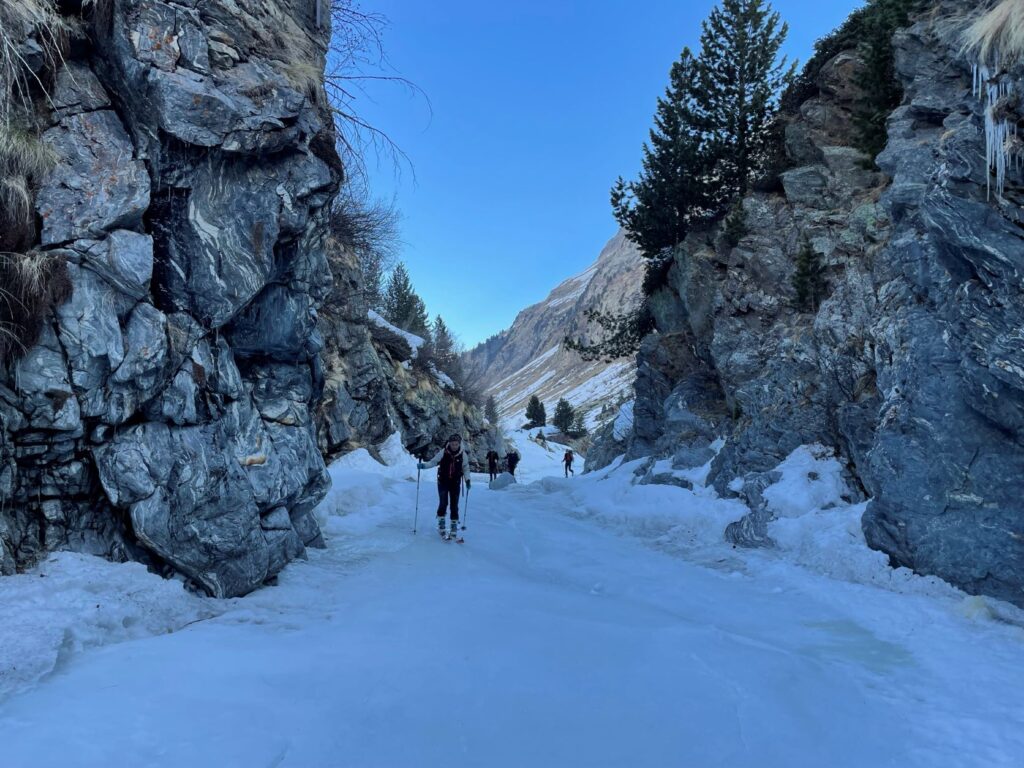 Incontriamo tante cose, ma ancor di più esploriamo una vera geografia della montagna, con il potere dell’attenzione, che parte dallo sguardo, ma passa attraverso il dono dei sensi… e dei piedi che indirizzano gli sci sulla neve…