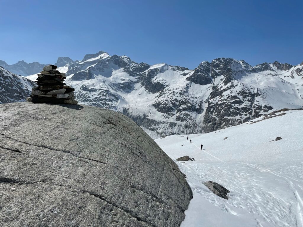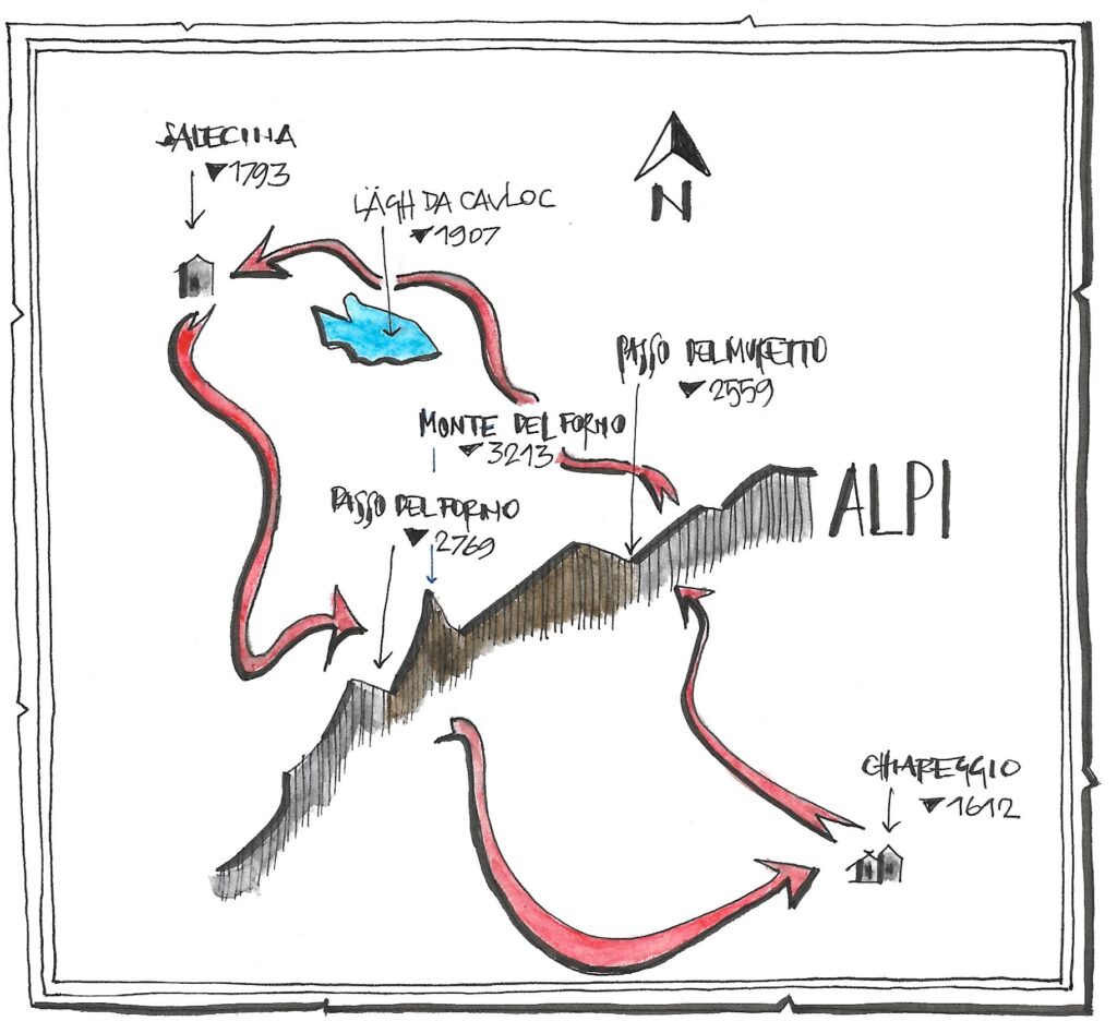 La via del Muretto, da qui son passati cacciatori primitivi, soldati, pellegrini, viandanti, carovane di uomini e cavalli carichi di vino, sale, spezie, grani… emigranti, contrabbandieri..Il Passo del Muretto 2559mGli ampi pendii della Val Muretto verso il Maloja Poco dopo l’ingresso in Val Forno presso il Lägh da Cavloc Salecina un rifugio sicuroVerso il nuovo valico, a Plan Canin, lungo il greto dell’Orlegna Compare il granitoSpazio e silenzio nel bacino del FornoLa via per la Sella del Forno si stacca a perpendicolo dal ghiacciaio, sullo sfondo le cime più alte del MasinoLa Sella del Forno 2796mUn saluto a Ettore CastiglioniLingue di neve e anfiboliti ci guidano verso valleLa splendida Val Bona, sotto la cresta del Gerva e il passo appena attraversatoIl torrente placa la sete..Scavalcare le Alpi
