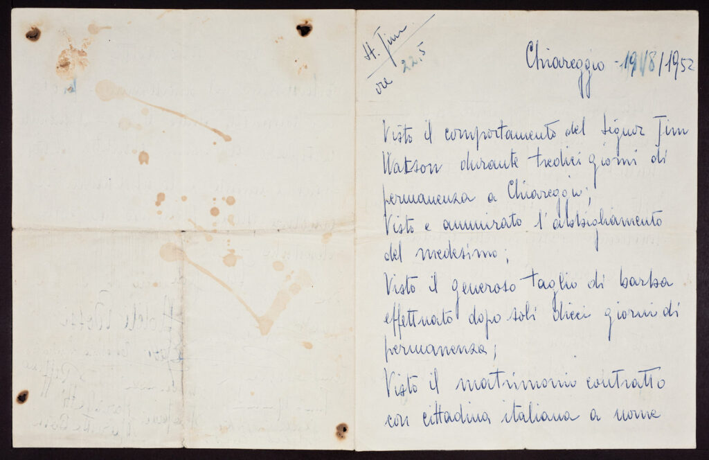 Nell’agosto 1952, James Watson va in vacanza nelle Alpi italiane a Chiareggio, insieme al biologo Joe Bertani che con la sua famiglia da diversi anni passava la vacanza là, in uno “small unpretentious hotel”.