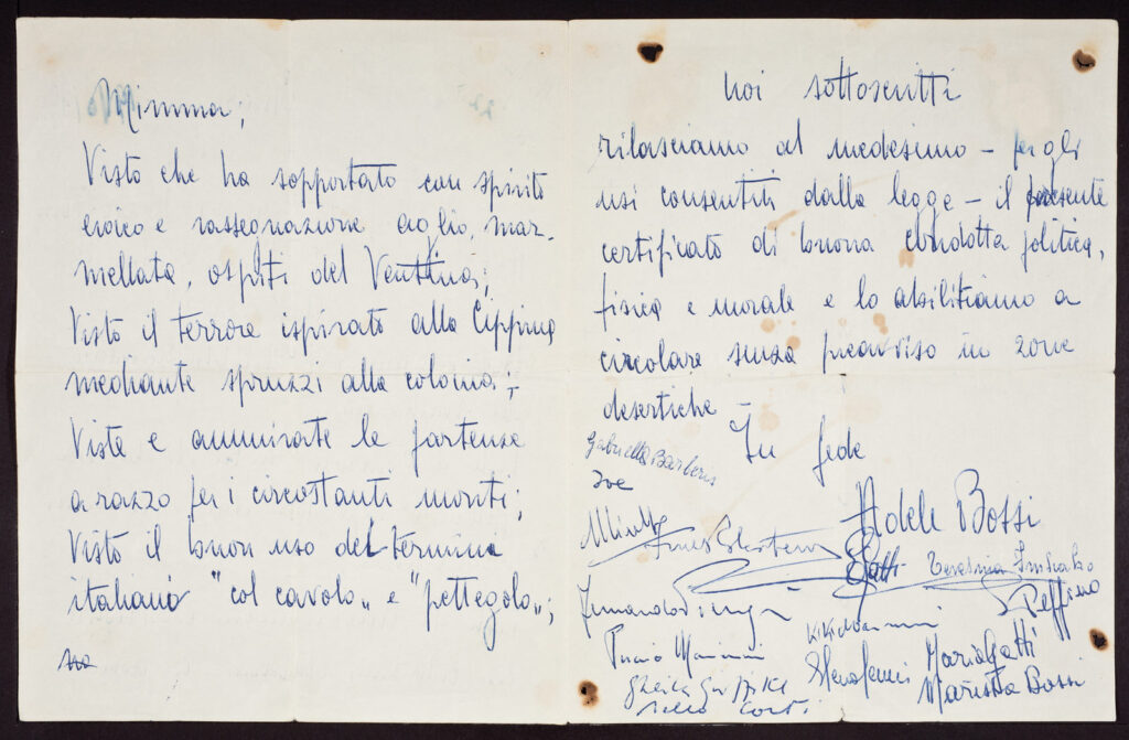 Tra i firmatari del documento si riconosce la firma di Nello Corti, figlio di Alfredo (scienziato tra i maggiori esploratori delle montagne Valtellinesi) che assieme a mio nonno Isacco Dell’Avo salì nel 1939 la Nord del Piz Palù occidentale per due diverse nuove vie.