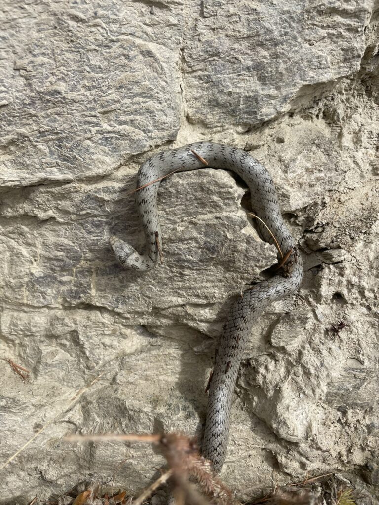 Il tepore risveglia la schiva Coronella austriaca. Si muove lenta, mimetizzandosi tra le filladi spaccate del versante.