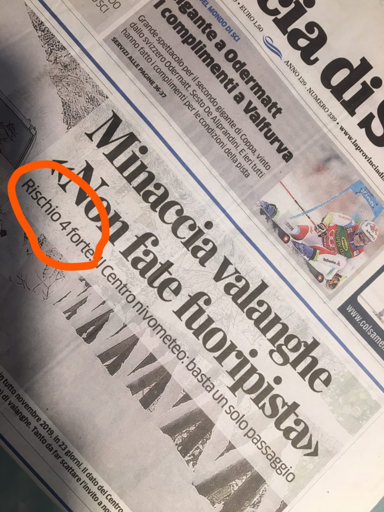 In altri termini l’indice di pericolo fotografa la stabilità del manto nevoso e il sovraccarico necessario per provocare il distacco di una valanga, il rischio dipenderà da mille altri fattori concomitanti: il luogo prescelto per l’uscita, morfologia, pendenza, l’orario, vegetazione, le temperature, la numerosità del gruppo, le interferenze con altri frequentatori della montagna, la geometria della traccia, la linea di discesa, le cadute….
