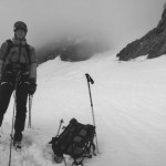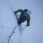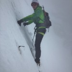 La finestra di bel tempo prevista per domenica non arriva o meglio arriva con qualche ora di ritardo.. Nel frattempo in cordata con il tenace Andrea raggiungiamo il più alto tra i rifugi di Lombardia nel bel mezzo di una tormenta. La via ferrata lungo le rocce è ricamata di ghiaccio e l’unica via di salita passa ora lungo l’erto canale di Cresta Guzza. Saliamo in condizioni di whiteout quasi totale affondando nella neve profonda gettata di continuo dal vento, tenendo come rotta di riferimento la linea scura delle rocce che bordano il couloir, confortati dalla conoscenza quasi millimetrica del canale e dall’accoglienza che da lì a breve il Bianco (gestore del rifugio) saprà, al solito, riservarci.